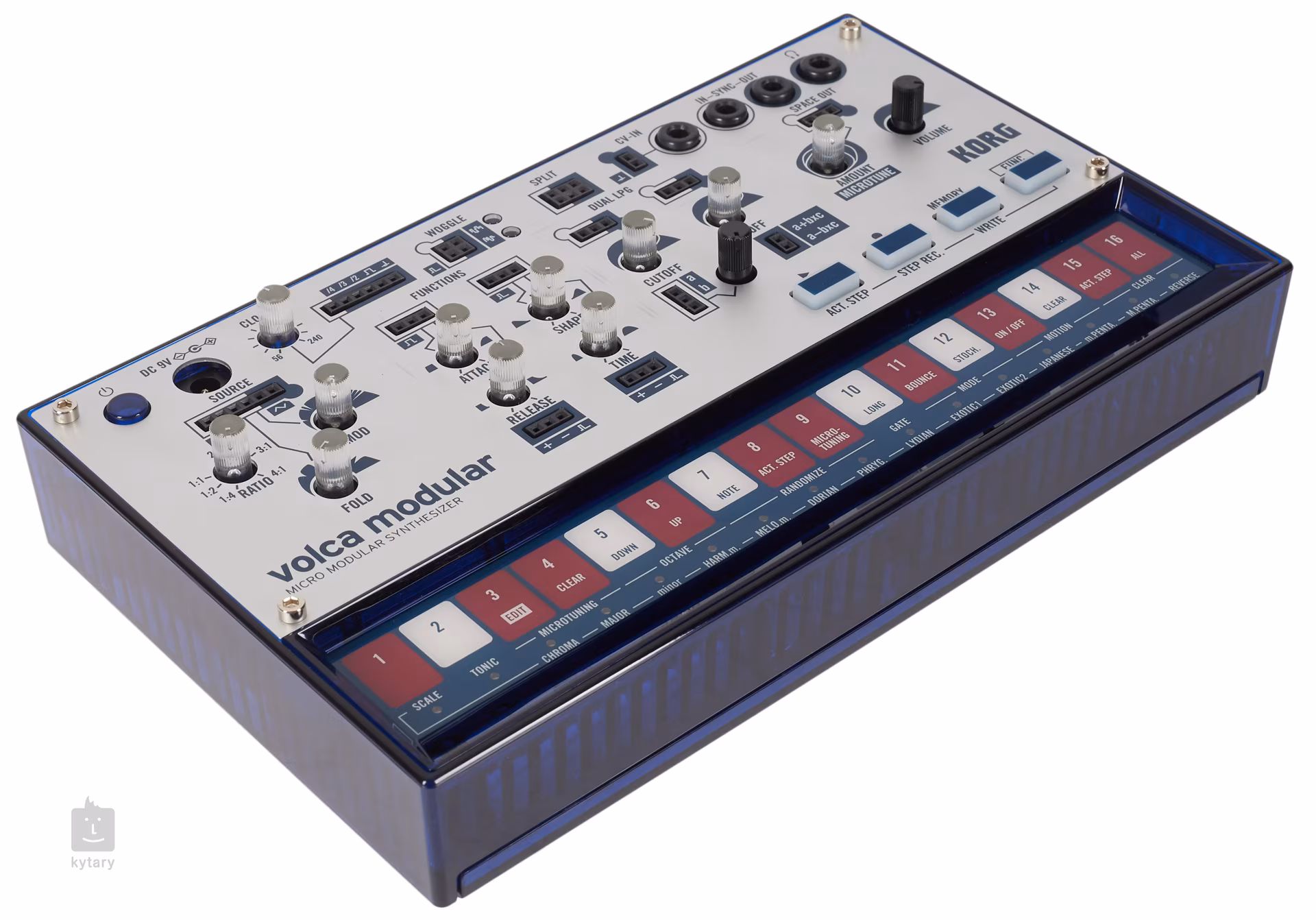 Zapojte sa O pripojenie sa starajú 3,5 mm vstupné a výstupné konektory pre hodiny a vstup CV s konektorom TRS (ľavý ±5 V, pravý 1 V/Oct), z ktorých môžete signály smerovať do riadiaceho modulu. Korg Volca Modular tak môžete pripojiť k ďalším Volcam, PO od Teenage Engineering, modulárnemu syntetizátoru, sekvenceru SQ-1 alebo syntetizátorom Korg Monologue, Minilogue, Prologue a ďalším.