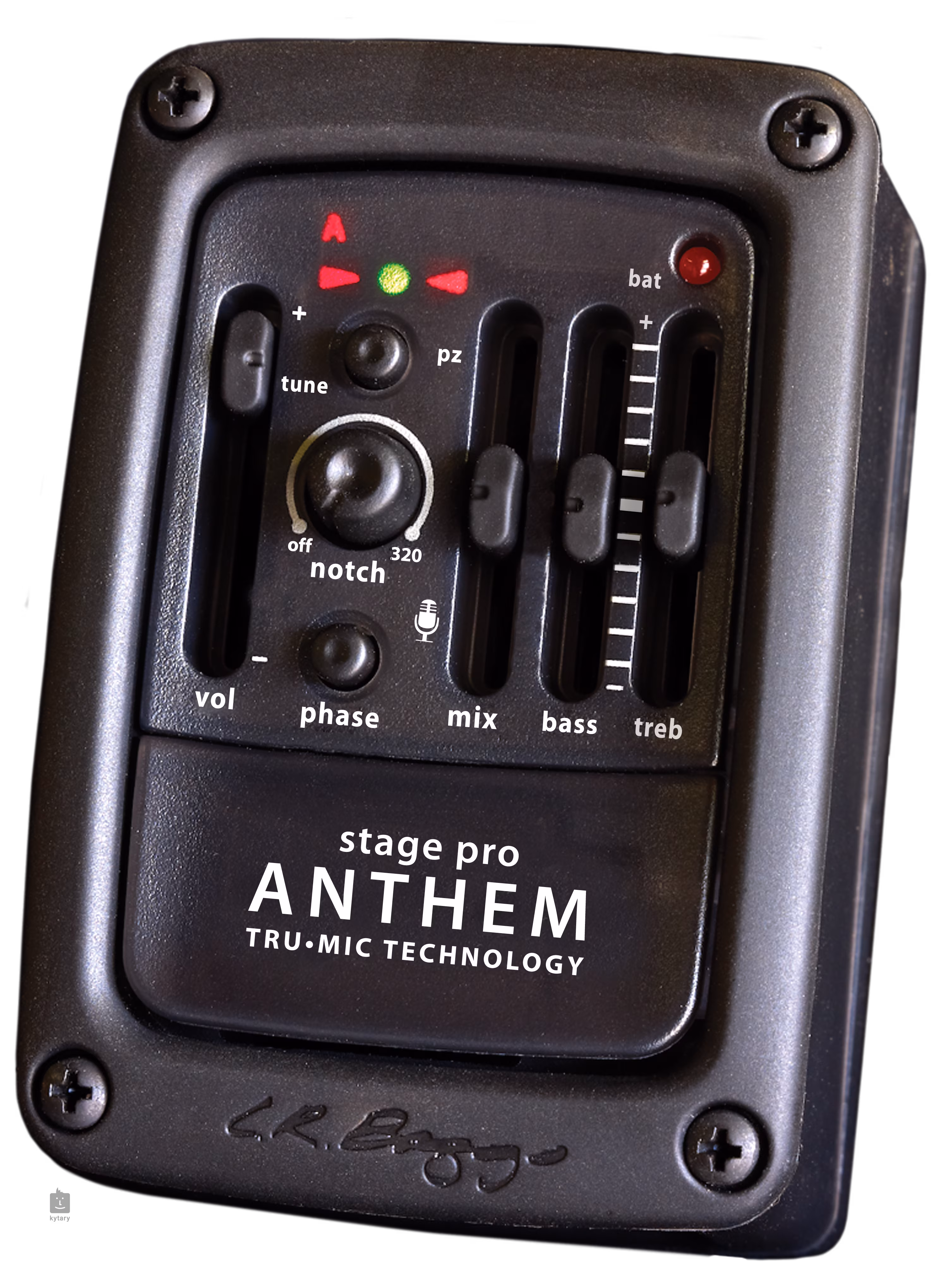 Predzosilňovač Stagepro Anthem s gitarovou zadnou inštaláciou ponúka jednoduchý prístup k batériám, vstavanú chromatickú ladičku a pokročilé možnosti úpravy zvuku, pričom ovládanie hlasitosti a fader MIX (pomer mikrofón/zvuková aparatúra) dopĺňa dvojpásmový ekvalizér (basy, výšky) a ovládanie Notch Filter a Phase na potlačenie spätnej väzby.