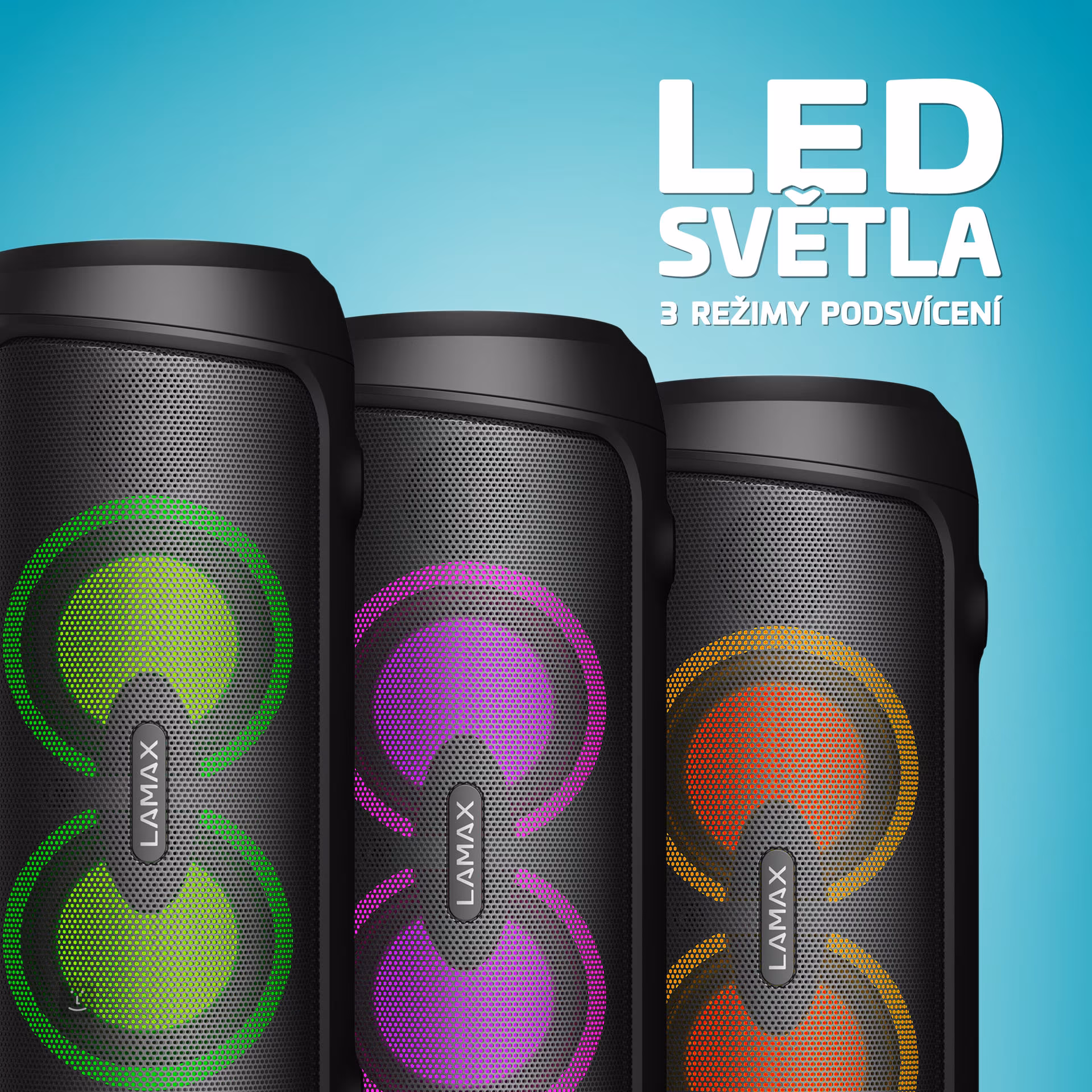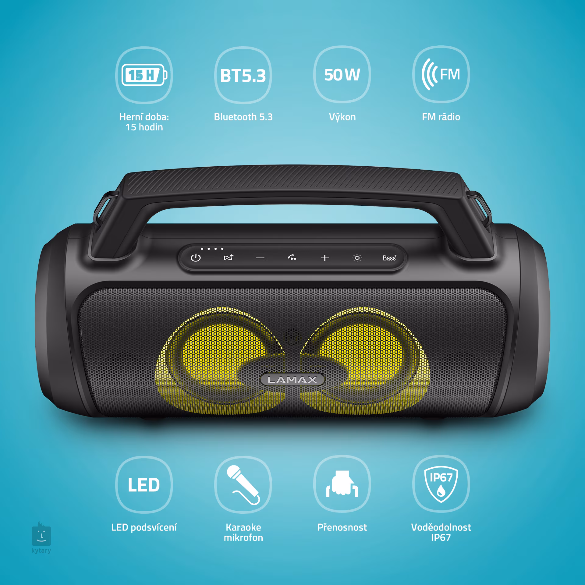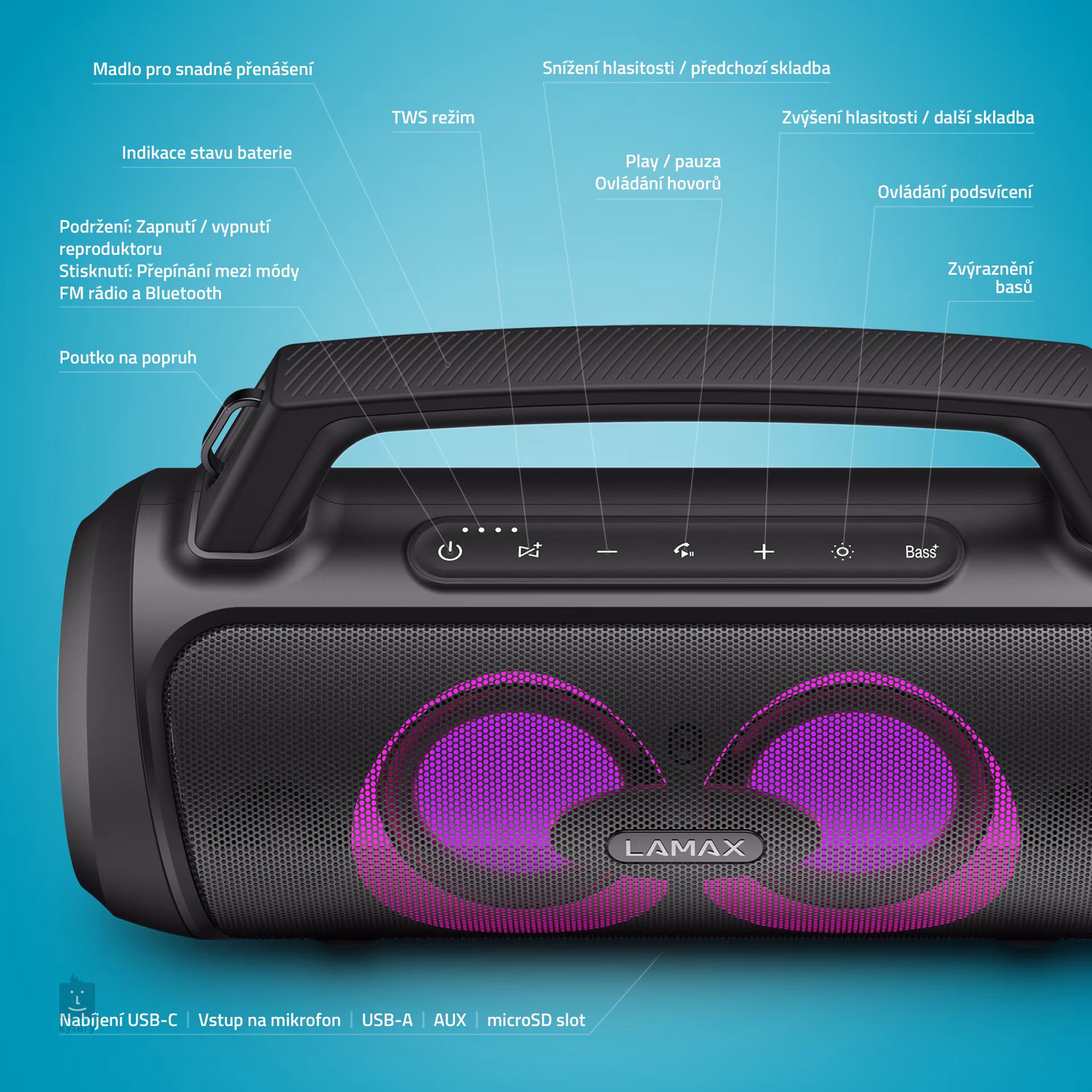 LAMAX PartyGo1 Play je kompaktný prenosný reproduktor s výkonom 50 W, ktorý prekvapí silným a plným zvukom vďaka technológii LAMAX BeatBass®. Ovládanie basov a hlasitosti na ovládacom paneli umožňuje prispôsobiť zvuk podľa vašich predstáv.