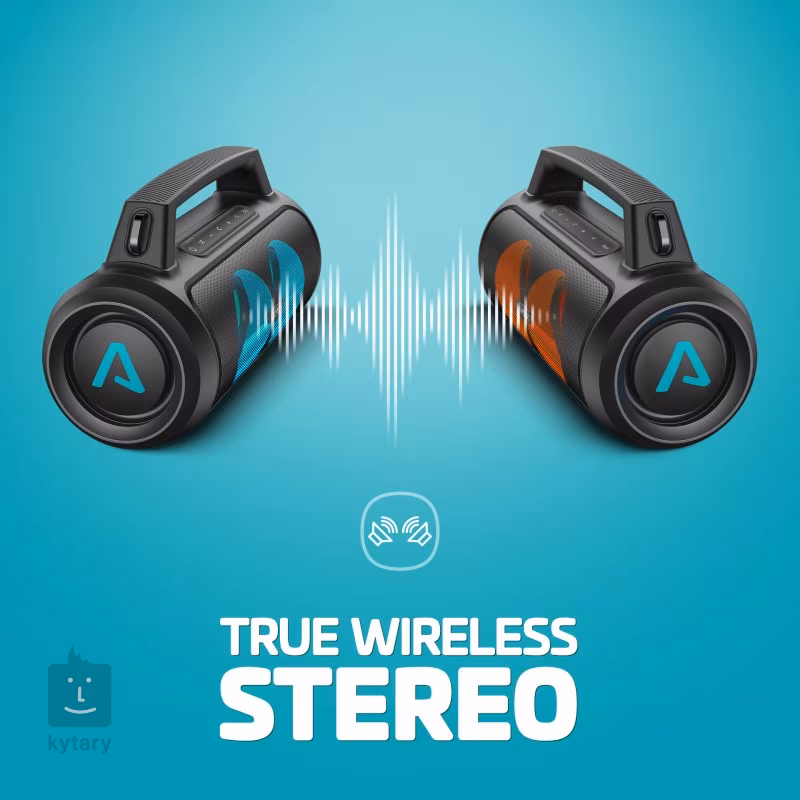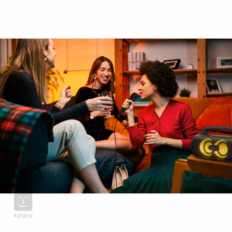 Každú párty alebo oslavu dokonale oživia tri režimy LED podsvietenia, a keď príde čas na prejav alebo vyvrcholenie večera v podobe karaoke, stačí pripojiť priložený mikrofón a o zábavu je postarané. Reproduktor sa automaticky spáruje s akýmkoľvek zariadením prostredníctvom bezdrôtového pripojenia Bluetooth 5.3 s dosahom až 18 m. Batéria s kapacitou 8000 mAh a výdržou až 20 hodín dokáže nabíjať vaše mobilné zariadenia. Praktická rukoväť, ramenný popruh a norma odolnosti voči vode IP67 priamo nabádajú k tomu, aby sa PartyGo1 stal vaším spoľahlivým spoločníkom na výletoch alebo dovolenkách. Okrem najbežnejšieho BT pripojenia sa môžete spoľahnúť na vstup USB, prehrávanie z karty microSD alebo možnosť zosilnenia zvuku zo vstupu AUX. K dispozícii je aj obľúbená funkcia párovania dvoch zariadení PartGo1 na väčšie podujatia. Integrovaný mikrofón pre hlasové ovládanie Siri alebo Google Assistant dokáže okrem iných funkcií prijať, ukončiť alebo odmietnuť telefónny hovor.