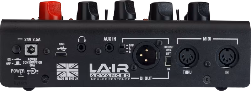Na zadnom paneli nájdete slúchadlový výstup pre tiché domáce cvičenie, Aux in pre prehrávanie sprievodných skladieb a transformátorom izolovanú efektovú slučku pre integráciu vašich obľúbených pedálových efektov. K dispozícii je aj konektor USB-C na pripojenie k aplikácii LAIR, priame pripojenie k vášmu DAW alebo aktualizáciu firmvéru. K dispozícii je aj MIDI in/thru na pripojenie externých ovládacích zariadení. Súčasťou balenia je 24V adaptér na napájanie.