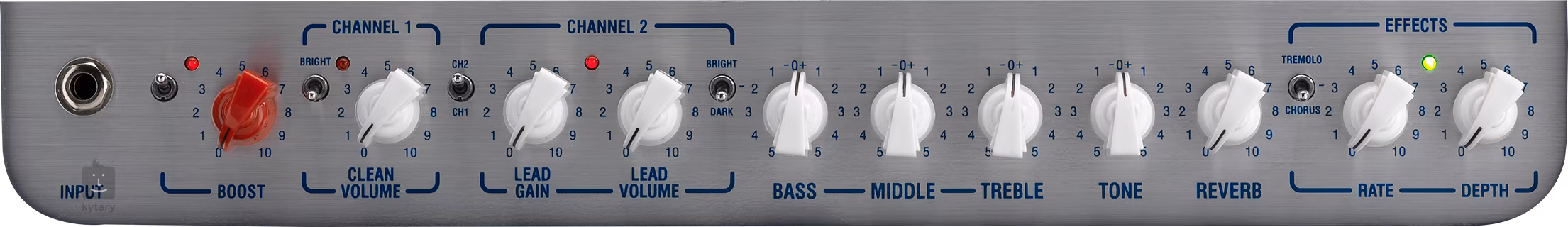 Boost, Clean Volume, Lead Gain, Lead Volume, Bass, Middle, Treble, Tone, Reverb, Rate, Depth, switches: Boost, Bright, CH1/2, Bright/Natural/Dark, Tremolo/Spiral Chorus