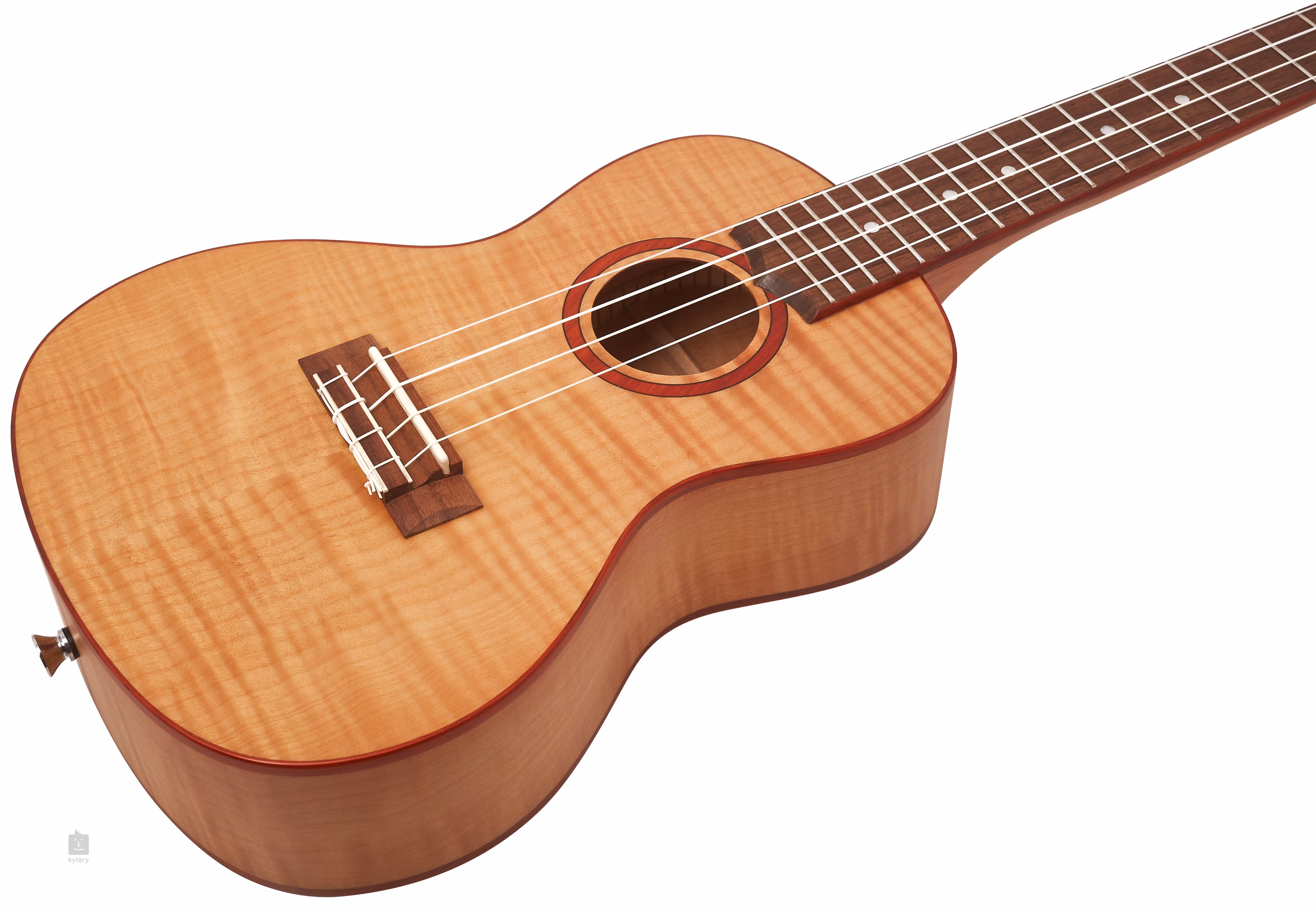 Telo tohto koncertného ukulele je vyrobené z dyhovaného javora, ktorý okrem pôsobivého vzhľadu dodáva nástroju jasný tón s výraznejšou charakteristikou v strednom pásme. Orechový hmatník je osadený osemnástimi pražcami s polohovými značkami pre ľahšiu orientáciu. Širší krk nástroja a nultý pražec ponúkajú pohodlné uchytenie a pohyb hmatníka, zatiaľ čo sedlo NuBone XB a nultý pražec poskytujú dobrý sustain strún. Stabilitu ladenia zaručujú kvalitné otvorené pochrómované mechaniky. Vizuálny dojem podčiarkuje rozeta a väzba (telo a hmatník) z exotického krvavého dreva, ktoré krásne kontrastujú s farbou fládrovaného javora. Ukulele sa dodáva s gig bagom s 10 mm hrubým polstrovaním.