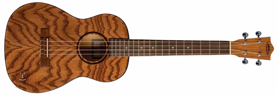 Struny cez nultý a sedlový pražec NuBone XB držia chrómové otvorené ladiace mechaniky a hmatník z figového dreva. Štýlovú povrchovú úpravu podčiarkuje topoľové obvodové lemovanie a rozeta. Ukulele sa dodáva v gig bagu.