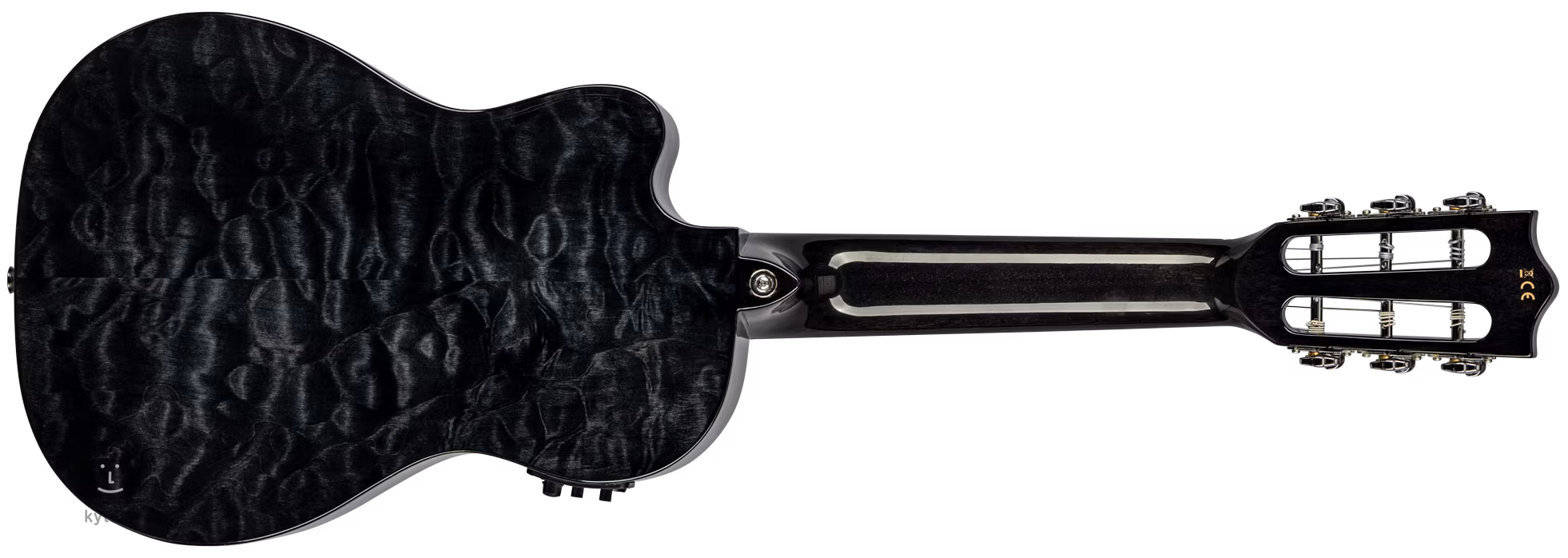 Elektroakustické gitarové ukulele Lanikai LKUQMBKCEG zaujme telom vyrobeným výhradne z javora, ktoré nástroju dodáva bohatý a vyvážený zvuk. Atraktívnu kresbu vločkového javora zvýrazňuje lesklá čierna povrchová úprava. Figový hmatník je osadený pätnástimi pražcami a stabilitu ladenia zaručuje nultý pražec NuBone XB s upevnením strún v otvorených niklových mechanikách Grover.