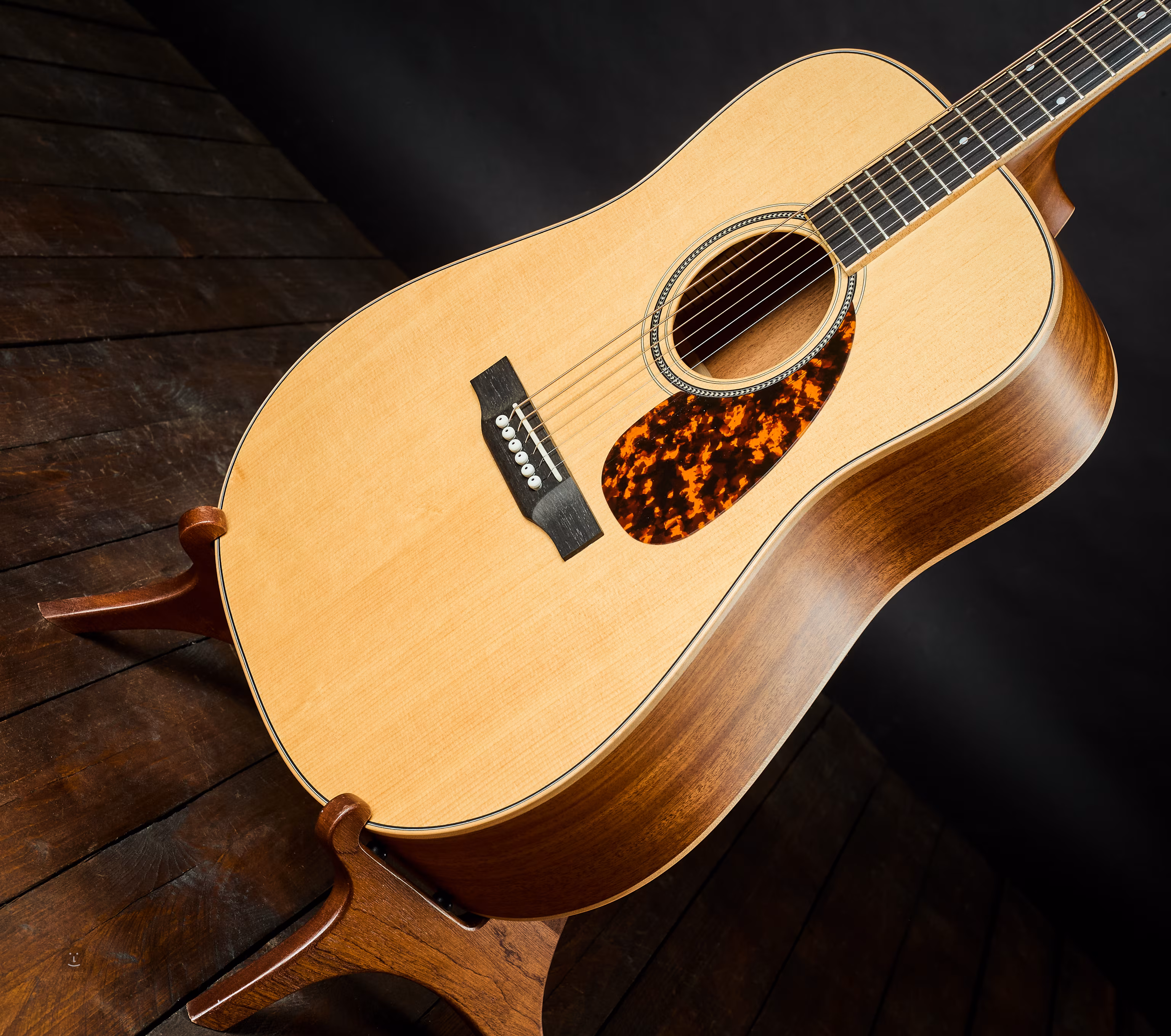 Telo a krk: masívny africký mahagón Khaya; hmatník a kobylka: eben; vrchná doska: masívny smrek Sitka. Nultý pražec a sedlo sú vyrobené z kosti. Hmatník a telo sú diskrétne lemované javorovým lemovaním a značky pražcov sú elegantné bodky. Šírka pri nultom pražci: 43 mm.