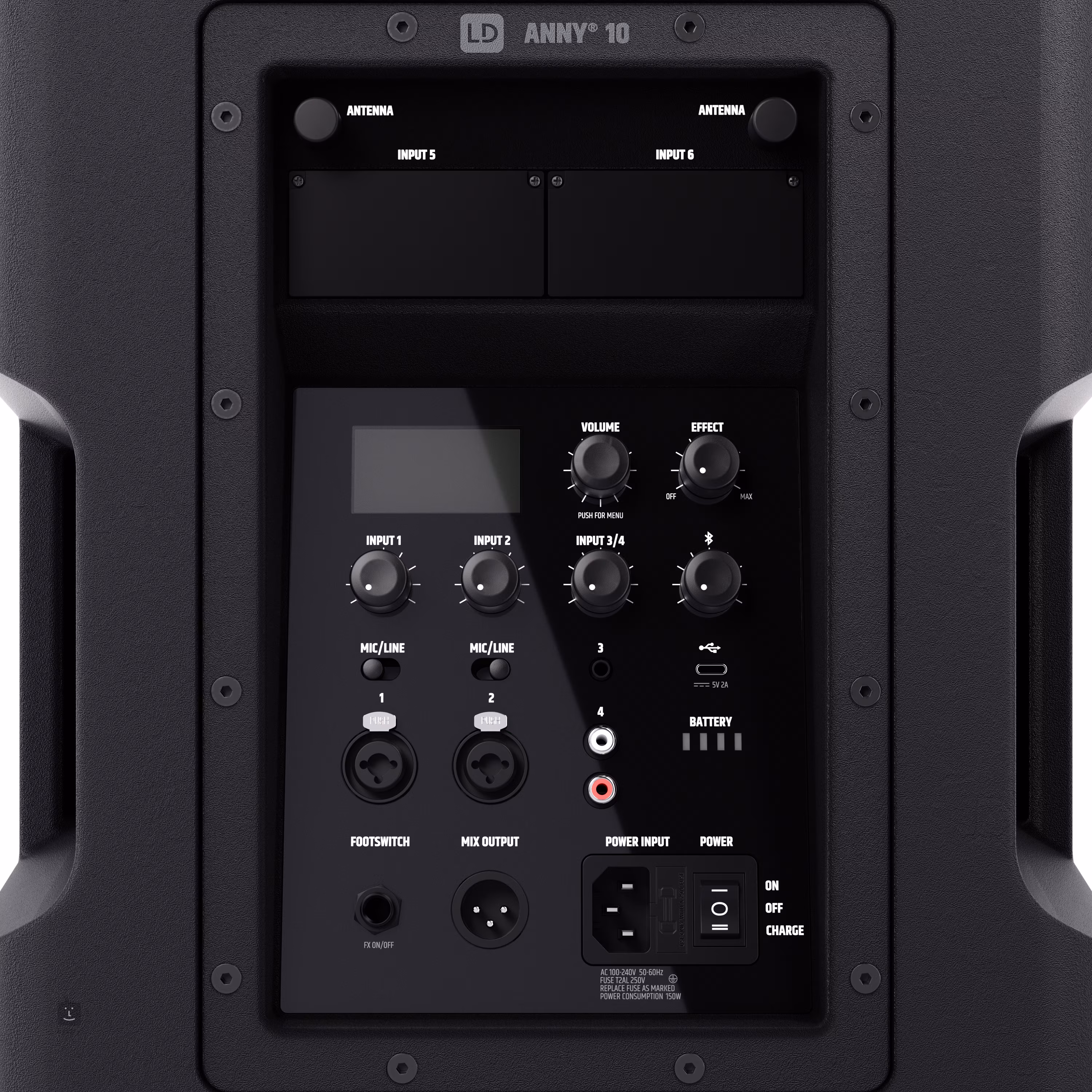 2x Combo XLR/Jack 6.3 mm (mic/line), 1x Jack 6.3 mm, 2x RCA, 1x Footswitch, Bluetooth