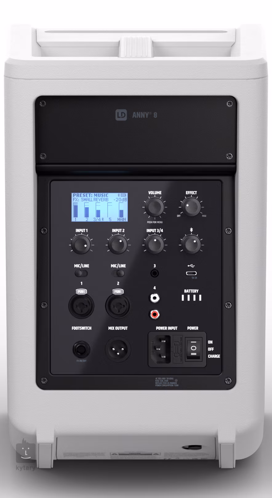 2x Combo XLR/Jack 6.3 mm (mic/line), 1x Jack 3.5 mm (aux), 2x RCA, 1x Jack 6.3 mm (footswitch), Bluetooth