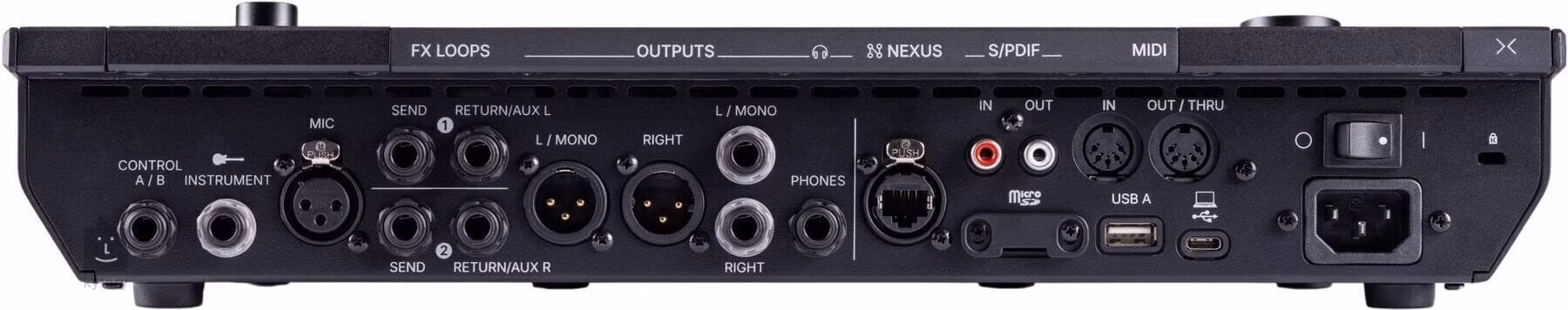 Revizí prošel také zadní panel, který nově poskytuje rozšířené možnosti konektivity. K dispozici je standardní nástrojový vstup pro připojení kytary, mikrofonní XLR vstup s dedikovaným preampem a fantomovým napájením, S/PDIF a Nexus konektory pro přenos digitálních informací, USB-C a USB-A porty pro propojení s různými zařízeními a vyjímatelná 32GB SD karta. Dále zde najdete vstupy a výstupy pro dvě efektové smyčky, MIDI konektivitu a vstup pro napájecí kabel.