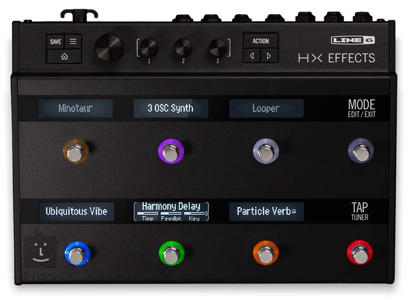 • Ovládanie 6x FS, 1x Mode/Edit/Exit FS, 1x Tap/Tuner FS, 1x Selector knob, 1-3 knobs (adjusting parameters), 6x Buttons (Save, Action)
