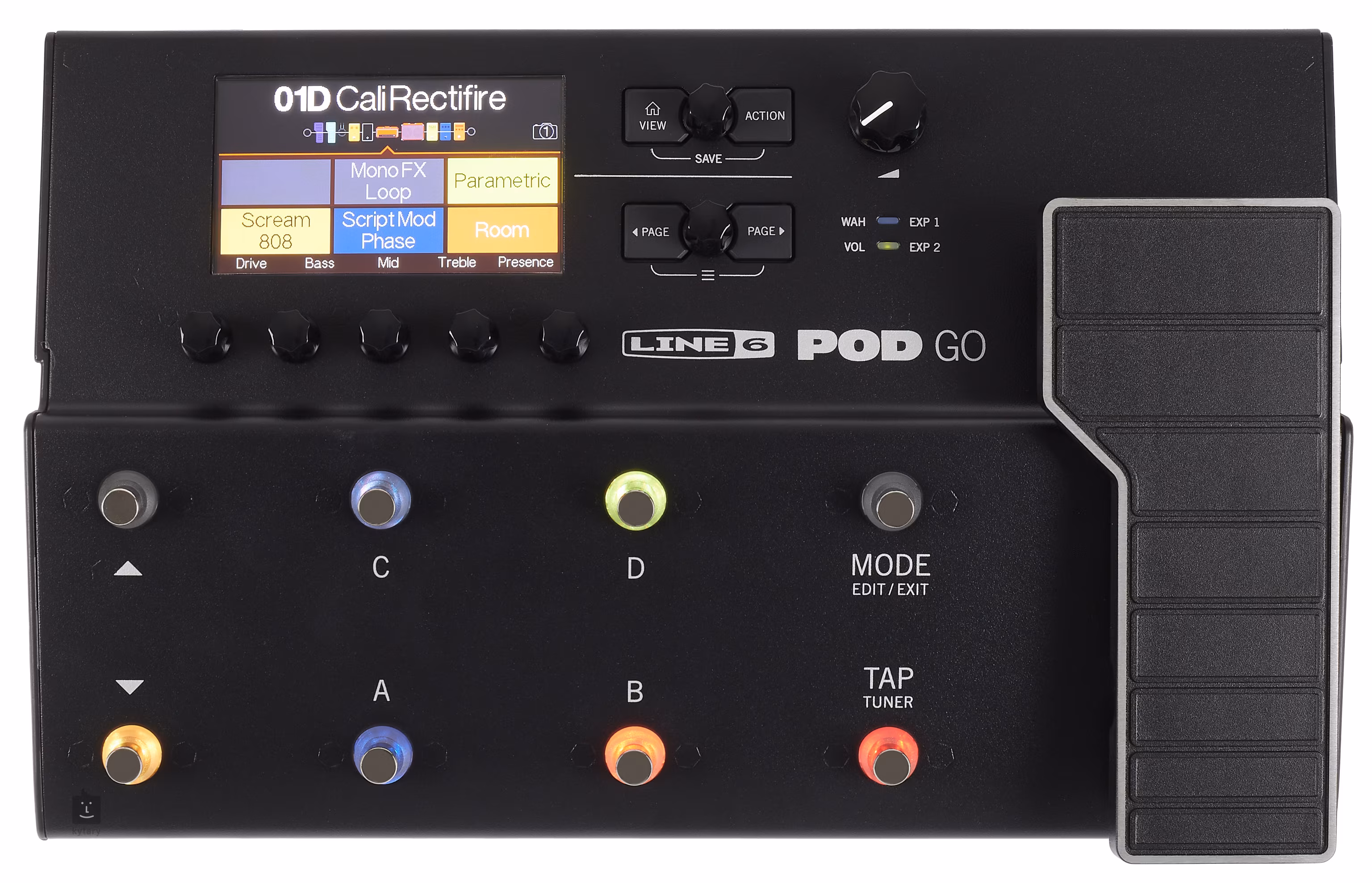 LINE6 POD GO je ľahký, ľahko prenosný gitarový multiefekt s jednoduchým používateľským rozhraním, ktorý môže nahradiť celé vaše gitarové vybavenie, t. j. pedálové efekty, zosilňovač a reproduktorovú skriňu. Je ideálnou voľbou pre situácie, keď nepotrebujete plnú hmotnosť a veľkosť štandardného gitarového vybavenia, t. j. pre hranie/nahrávanie doma, prezentácie, workshopy, ale slúži aj ako záložný zosilňovač. Jeho kompaktné telo ponúka 70 vysoko kvalitných emulácií známych značiek gitarových a basových zosilňovačov (Fender, Vox, Marshall, Friedman, MES Boogie, Soldano, Engl, Peavey, Ampeg, Aguilar, Pearce, Gallien-Krueger), 37 reproduktorových skríň (a možnosť nahrať až 128 užívateľských IR), 16 mikrofónov (dynamických, kondenzátorových, páskových), viac ako 200 gitarových efektov (v kategóriách Dist, Dynamics, EQ, Modulation, Delay, Reverb, Pitch/Synth, Filter), expresný pedál s vyhradenými efektmi wah/volume a 127 prednastaveniami, kde môžete pracovať so štyrmi snímkami v každom prednastavení, t. j. so štyrmi rôznymi zvukmi v rámci jedného prednastavenia. Jednoznačnou výhodou POD GO je jeho prehľadné a zrozumiteľné používateľské rozhranie s farebným LCD displejom, vďaka ktorému je prechádzanie efektmi/predvoľbami a ich úprava, ukladanie a vyvolávanie rýchle a jednoduché. Tieto úlohy je možné vykonávať pomocou tlačidiel a ovládačov na hlavnom paneli, pomocou nožných prepínačov (v režime Preset) alebo vo voľne dostupnej aplikácii POD GO Edit. Multiefekt ponúka aj efektovú slučku, ktorá umožňuje pripojenie k zosilňovaču pomocou metódy štyroch káblov, looper s kapacitou 40 sekúnd na slučku v mono (20 v stereo), vstavaný ladič, funkciu tap tempo, výstup pre externý expresný pedál, mono/stereo výstup z multiefektu, nesymetrický Amp Out, kde môžete používať len databázu efektov (bez modulácií zosilňovača a reproduktora), keď je pripojený k skutočnému gitarovému zosilňovaču, a výstup pre slúchadlá. USB rozhranie multiefektu vám umožňuje stiahnuť aktualizácie firmvéru alebo pripojiť multiefekt k počítaču pre pohodlné editovanie v aplikácii POD GO Edit. POD GO môžete tiež pripojiť k DAW na vašom PC/Mac/notebooku cez USB pre priame nahrávanie a re-amping (pri vzorkovacej frekvencii 24-bit/96kHz). Súčasťou balenia je adaptér, ktorý slúži na napájanie multiefektovej jednotky.
