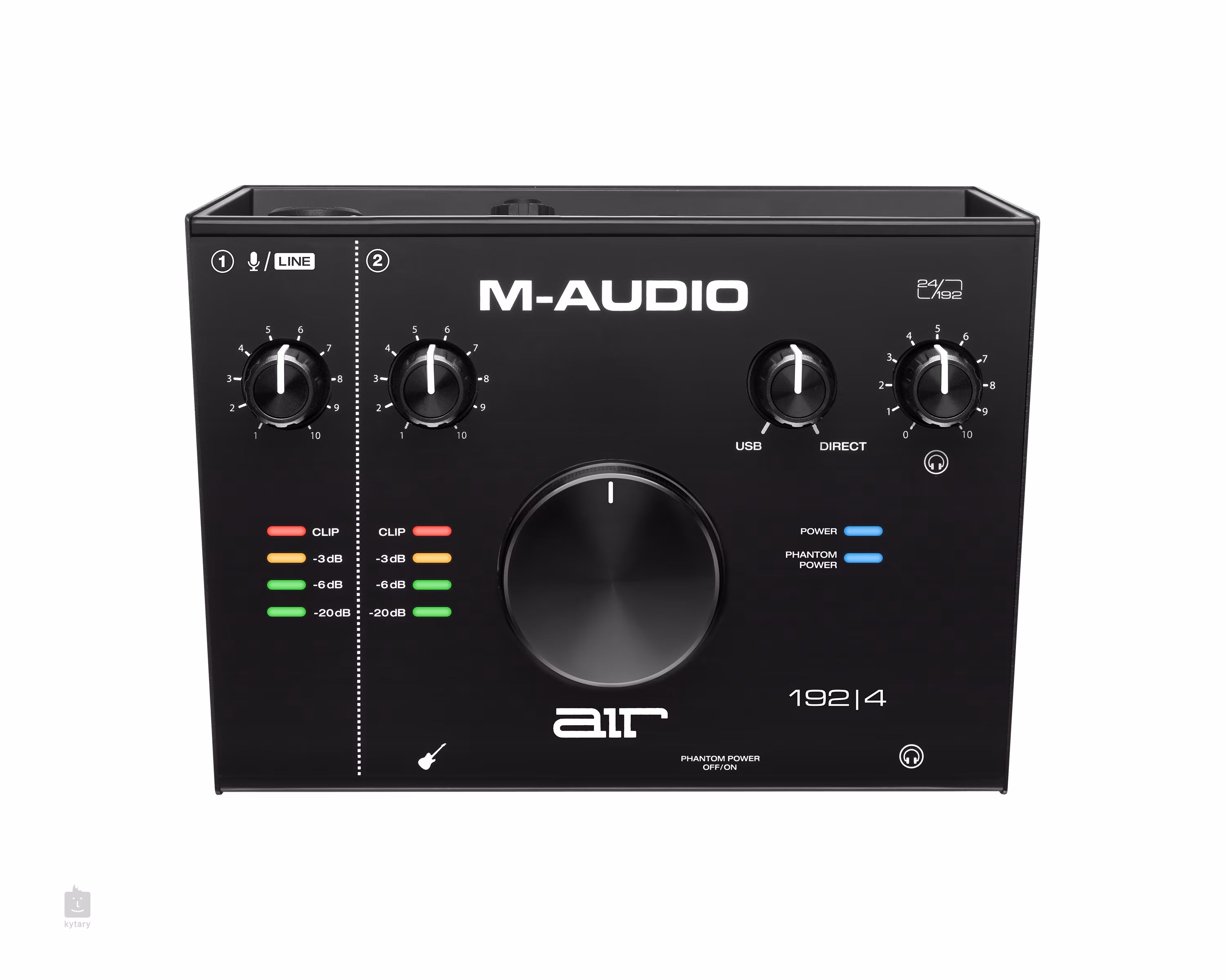 M-Audio AIR 192/4 Vocal Studio Pro Vocal Studio Pro je štúdiový set obsahujúci zvukovú kartu, kondenzátorový mikrofón a pohodlné uzavreté slúchadlá. Kompaktná dvojkanálová zvuková karta AIR 192/4 ponúka kvalitu zvuku 192 kHz/24 bitov a je vhodná na detailný monitoring počas nahrávania alebo postprodukciu vašich nahrávok. Predný panel je vybavený nástrojovým vstupom na pripojenie gitary, basgitary alebo klávesov, ako aj slúchadlovým výstupom na nočnú prácu a prepínačom fantómového napájania pre oba kanály. Horný ovládací panel vám potom ponúka dva potenciometre Gain pre vstupný signál, ovládač USB/Direct pre mix vstupného signálu, mohutný ovládač hlasitosti Main Volume a ovládač hlasitosti slúchadlového výstupu. Štvorstupňová LED stupnica vám potom poskytuje podrobný prehľad o hlasitosti vstupného signálu. Zadná strana vám ponúka stereo výstup pre štúdiové monitory, kombinovaný vstup pre mikrofón alebo iné hudobné zariadenia a ultrarýchly port USB (C) pre počítač alebo notebook. Súčasťou balenia sú dva káble USB a balík softvéru.