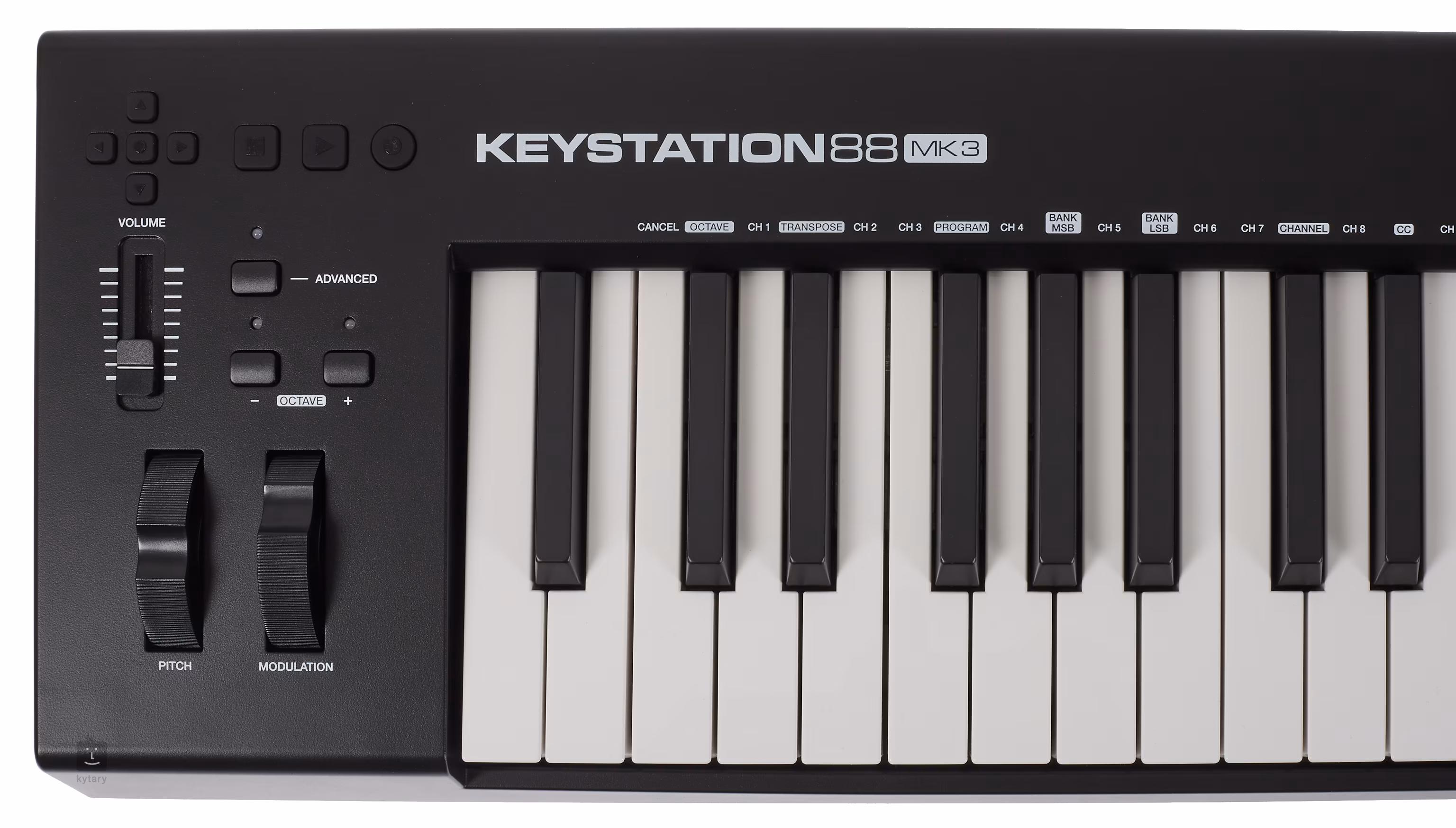 Na ďalšie ovládanie sú k dispozícii tlačidlá transpozície, ovládač hlasitosti a transportné funkcie na ovládanie hudobného softvéru, aby ste nemuseli siahať po myši.