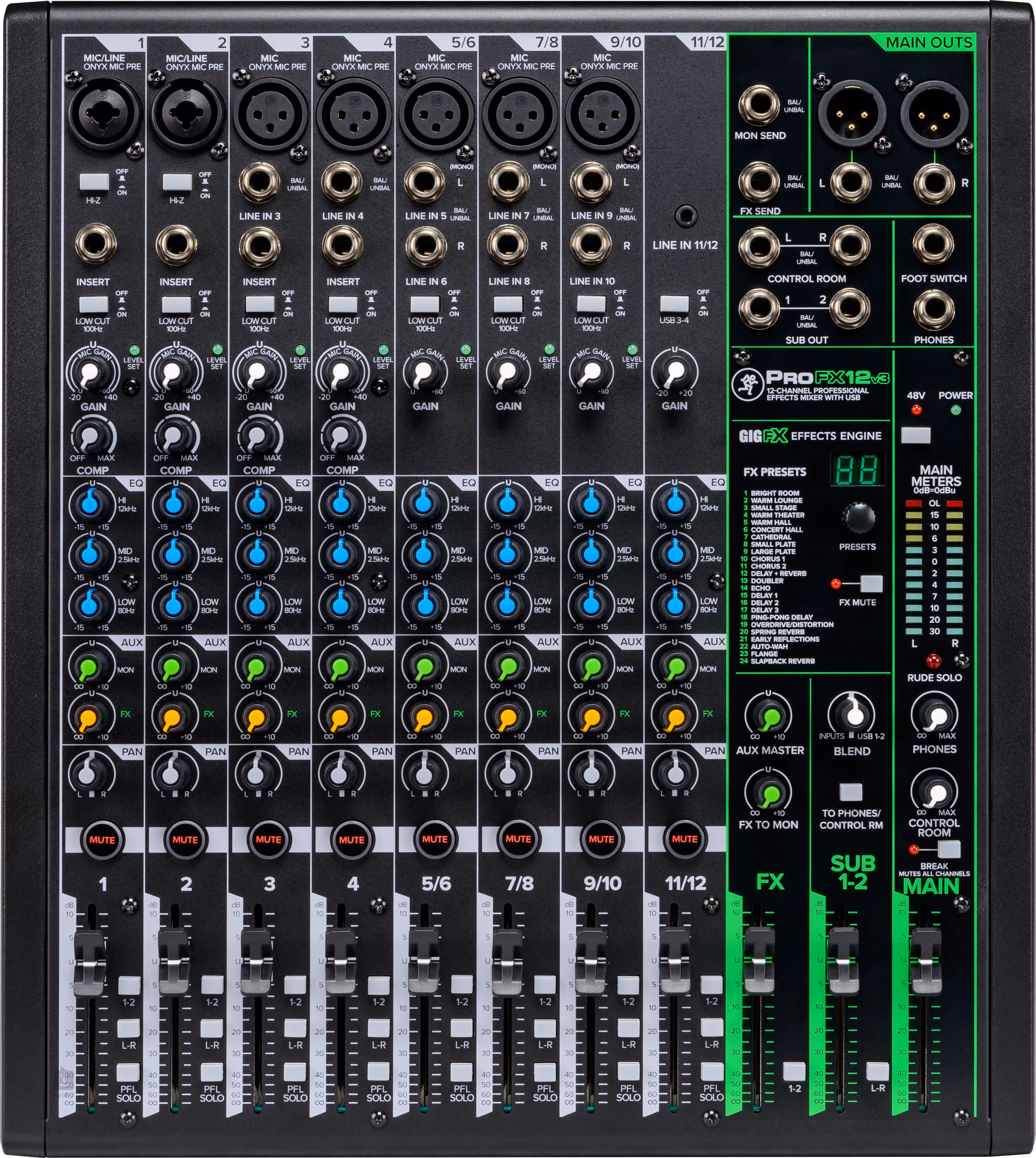 Konkrétne ProFX12v3 je dvanásťkanálový mixážny pult so siedmimi predzosilňovačmi Onyx a zvukovým strojom GigFX. Zvuk možno upravovať pomocou intuitívnych ovládacích prvkov a trojpásmového ekvalizéra na každom kanáli a okrem dvoch XLR/Jack kombo vstupov je konzola vybavená aj Hi-Z vstupom na priame pripojenie gitary/basgitary, piatimi XLR/stereo Jack vstupmi a Line IN pre hudobný prehrávač alebo mobilné zariadenie. K dispozícii je aj výstup na monitor, hlavný výstup, výstup na slúchadlá a vstup pre nožný prepínač.
