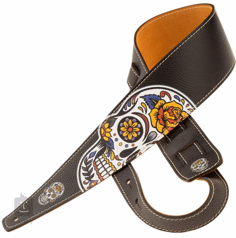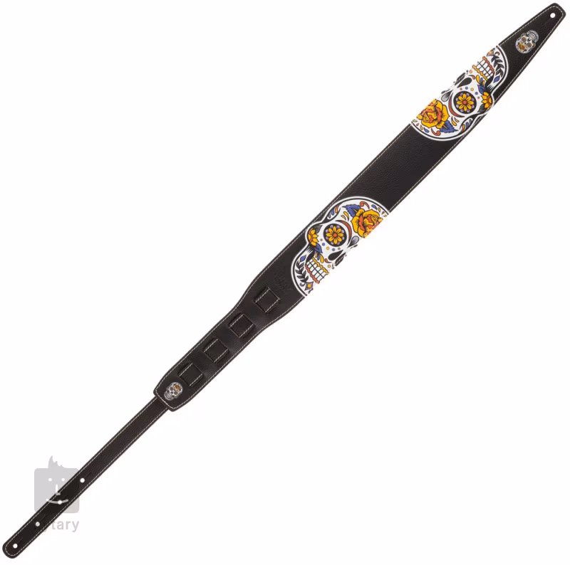 Kytarový popruh Holes HS Art Print Calavera Black 8 cm od italské značky Magrabò je vyroben z pravé kůže, která mu zajišťuje dlouhou životnost, odolnost a pohodlné nošení. Na první pohled zaujme nepřehlédnutelným designem, kterému dominuje barevná kresba lebky na černém pozadí. Kvalitní kůže se při nošení dokonale přizpůsobí vašemu tělu, takže vám poskytne pohodlí i při dlouhém hraní ve stoje. Tomu napomáhá i 8cm šířka popruhu, která zajišťuje rovnoměrné rozložení váhy nástroje na vašich zádech. Díky nastavitelné délce od 105 do 142 cm je popruh vhodný pro většinu hráčů, bez ohledu na výšku. Ideální pro akustické, elektrické i basové kytary.