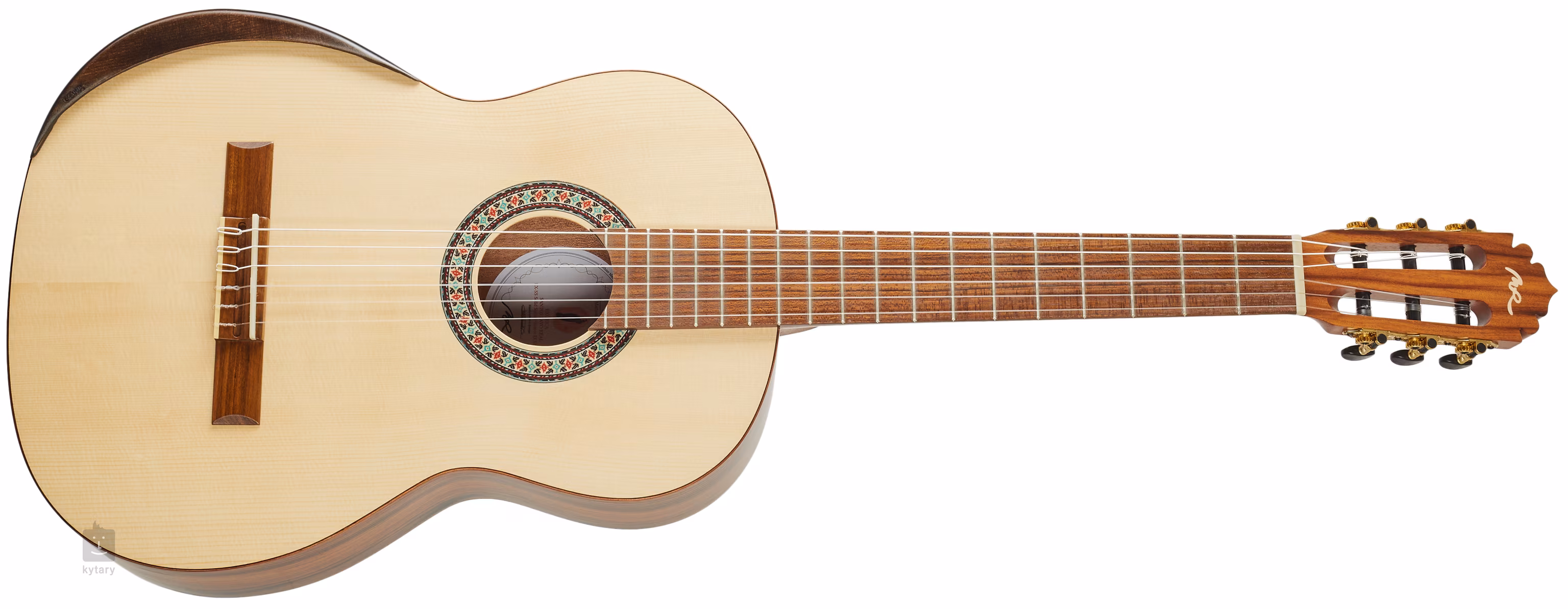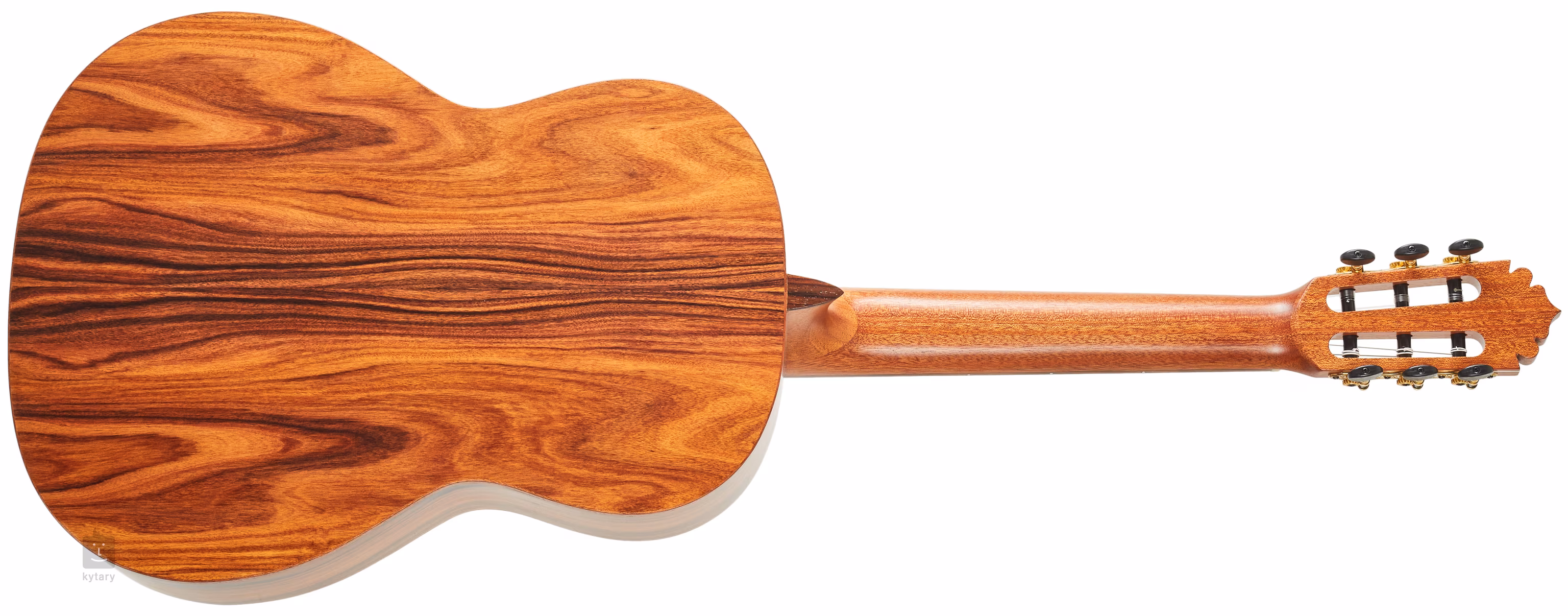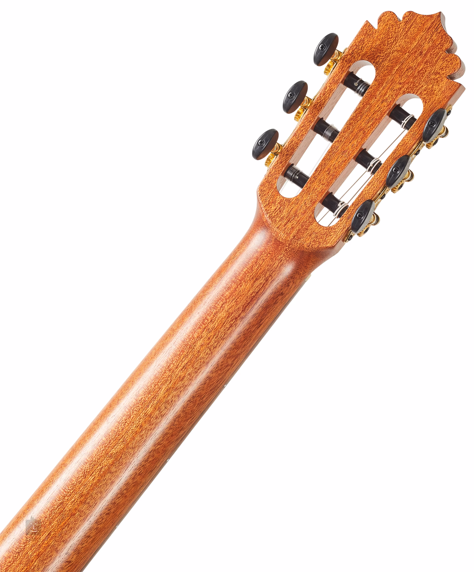 K mahagónovému krku je prilepený ovangkolový hmatník. Stabilné ladenie zaručuje uchytenie strún cez nultý a kompenzovaný sedlový pražec v pozlátených bezlaliatkových mechanikách s čiernymi kolíkmi a ovangkolovým hmatníkom. Štýlové spracovanie podčiarkuje pravý španielsky krk, ramenná opierka, dyha pau ferro na hlavici a saténový ECO lak na vodnej báze.
