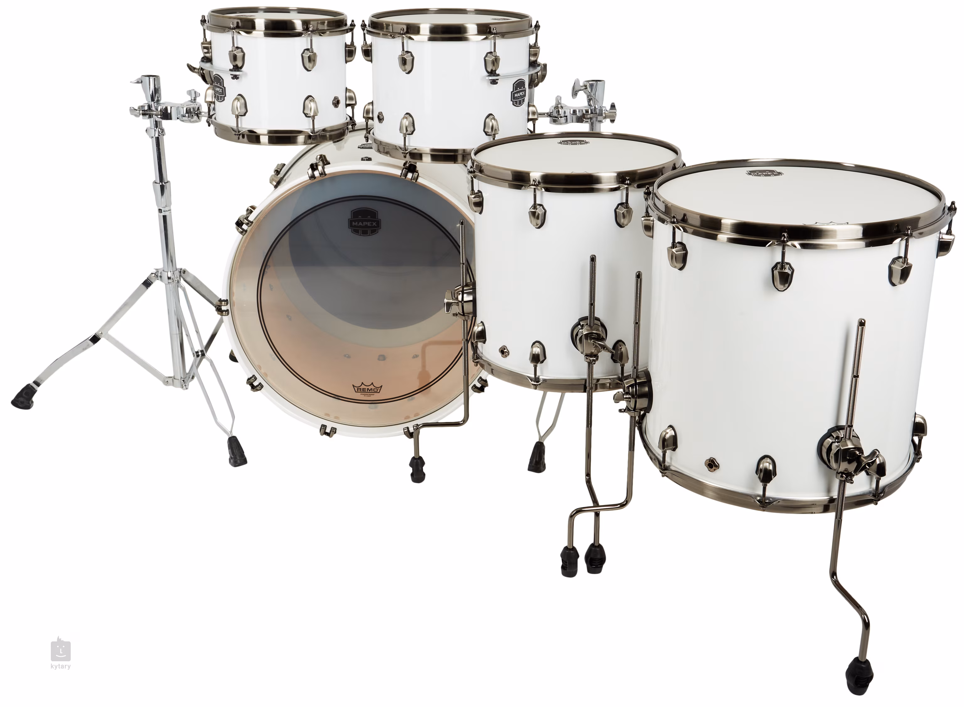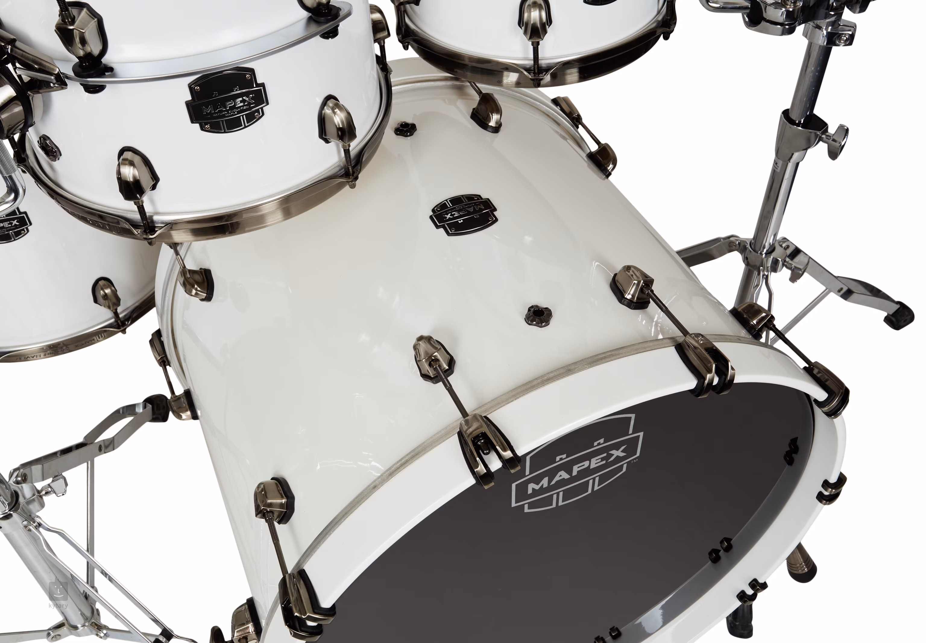 Bicia súprava Mapex Saturn Evolution Polar White Lacquer zo série Saturn Evolution Maple má hybridný korpus vyrobený z 8 vrstiev javora a orecha (javor/orech/javor) a systém tlmenia SoniClear, vďaka ktorému je blana v lepšom kontakte s korpusom bubna, čo prináša prirodzenejší, farebnejší a plnší zvuk. Vybavenie tom tomov revolučným systémom HALO otvára cestu k plnej rezonancii a umožňuje tom tomom znieť otvorene a jasne.