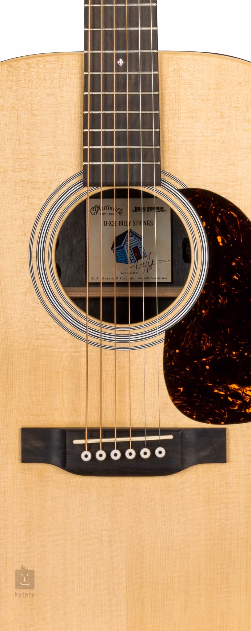 D-X2E Billy Strings je cenově dostupnější signature model amerického písničkáře a bluegrassového muzikanta známého jako Billy Strings. Podobně jako dražší model z řady Standard Series vychází ze specifik oblíbené Billyho kytary - předválečného Dreadnoughtu D-28. Přední deska kytary je vyrobena z masivu smrku, zadní deska a luby jsou zhotoveny z moderního materiálu HPL v dekoru brazilského palisandru. Tato kombinace materiálů nejen šetří životní prostředí, ale poskytuje nástroji dobré zvukové a herní vlastnosti. Dobré akustické vlastnosti kytary zvýrazňuje snížené žebrování typu X (Scalloped X-Brace) přední desky.