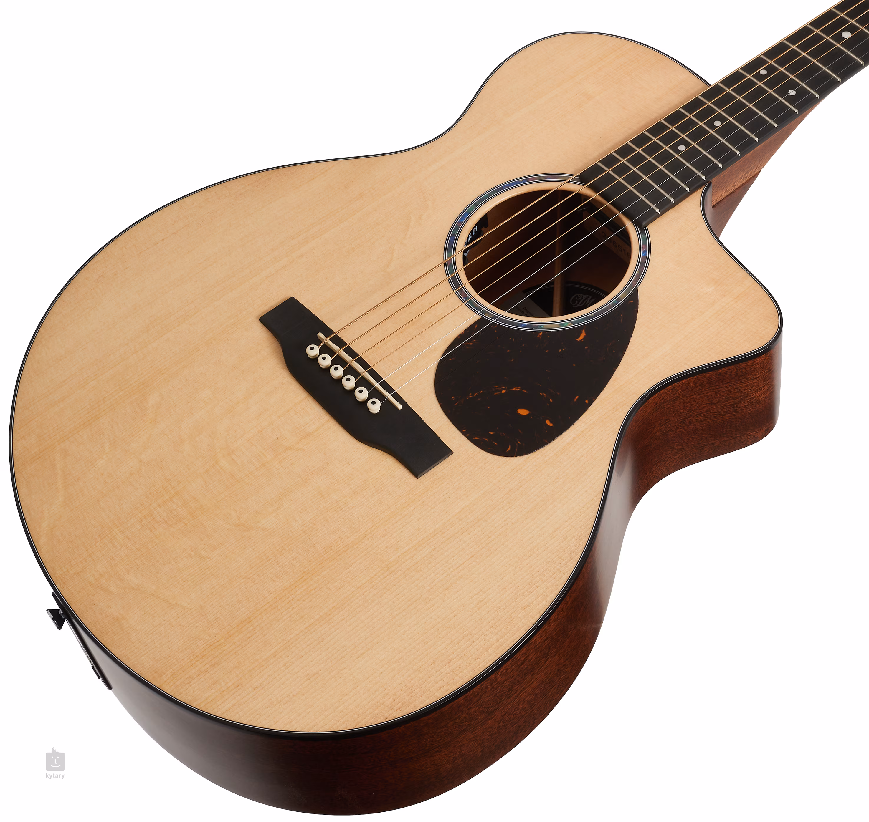 Elektroakustická gitara SC-10E Modern je moderný nástroj s mimoriadne pohodlným asymetrickým tvarom tela S-13 a patentovaným systémom Sure Align, ktorý zaručuje vynikajúcu hrateľnosť po celej dĺžke krku. Vrchná doska gitary je vyrobená z masívneho smreku, zatiaľ čo zadná doska a bočné dosky sú vyrobené z masívneho sapele. Krk Select Hardwood je pripevnený k telu na 13. pražci, čo je nezvyčajné. Dekoratívne imitácie perleťových značiek polohy a biele bočné bodky uľahčujú orientáciu na hmatníku.