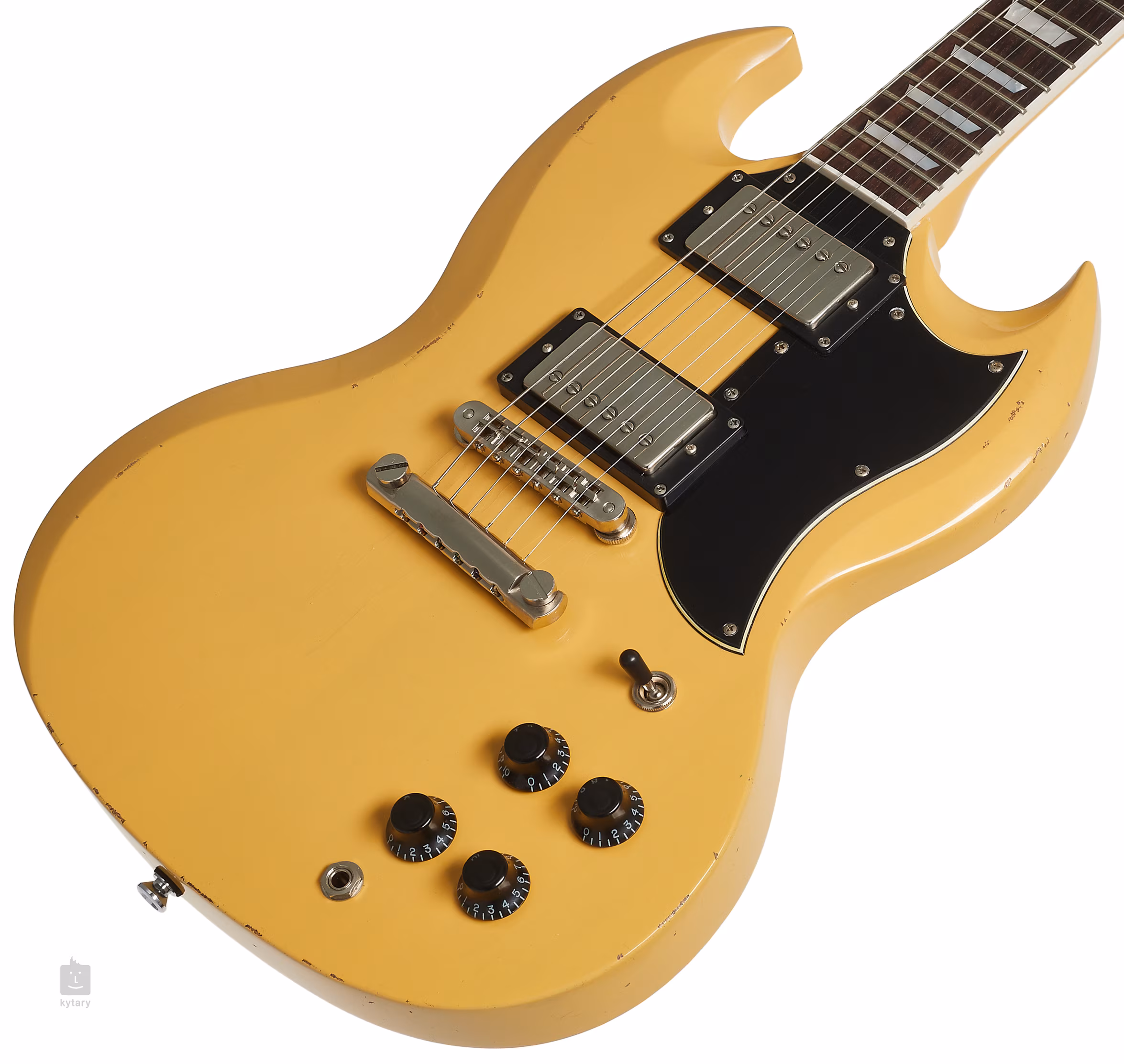 Maybach Albatroz '65-2 TV Yellow Aged je elektrická gitara s dvojitým výrezom v štýle SG, ktorá ponúka všetky klasické prvky spojené s týmto nástrojom - ľahké mahagónové telo s plochou vrchnou doskou, dvoma výrezmi a tvarovanými hranami, mahagónový krk a palisandrový hmatník s dvadsiatimi dvoma Medium Jumbo pražcami.