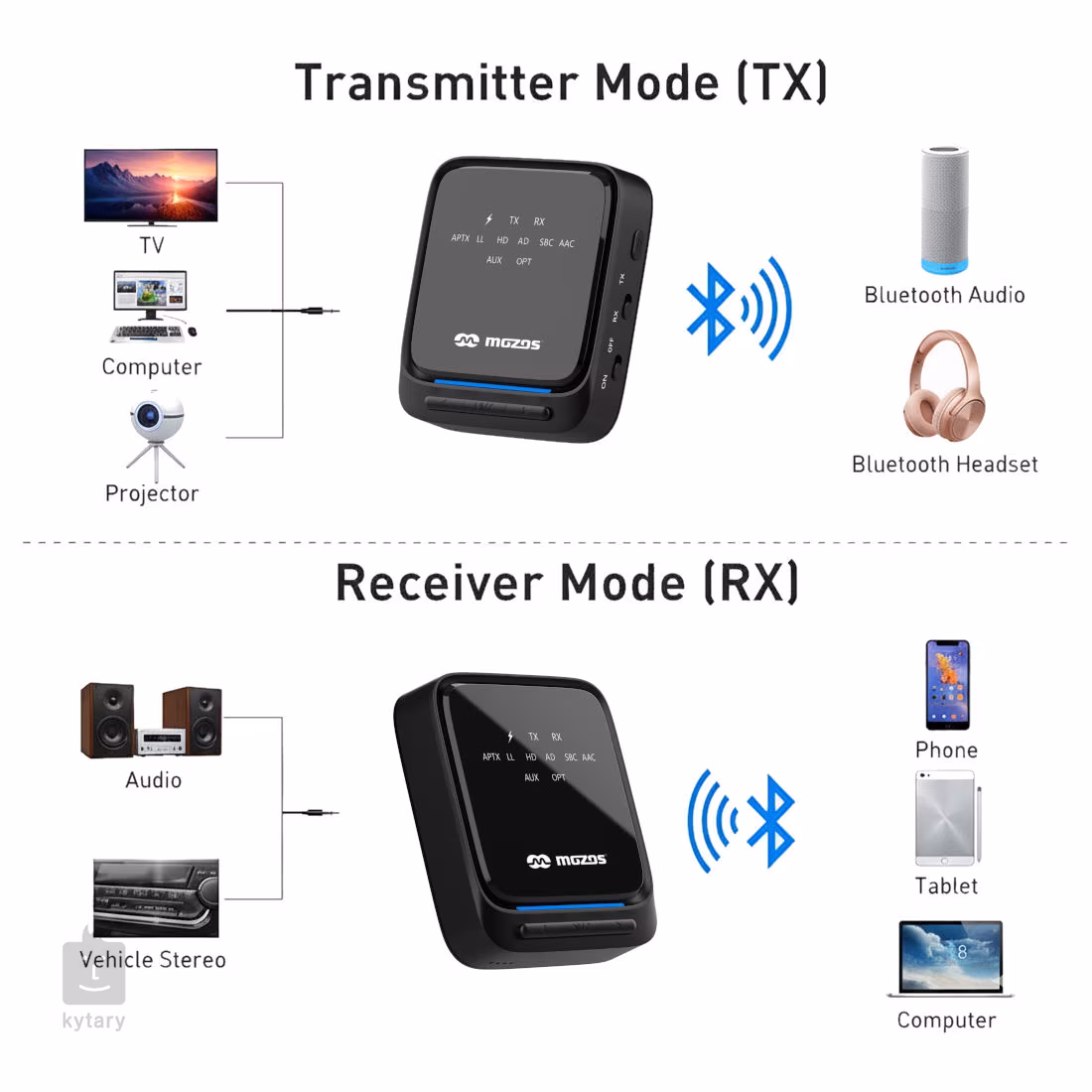 V režimu RX (přijímač) můžete snadno streamovat zvuk ze svého telefonu nebo notebooku do vašeho audio systému. Navíc je k dispozici vestavěný mikrofon pro handsfree volání. Režim TX (vysílač) umožňuje připojení až ke dvěma párům Bluetooth sluchátek nebo reproduktorů najednou, což je ideální pro synchronní poslech zvuku, například při sledování filmu ve dvou. Zařízení podporuje nejnovější audio kodeky, včetně aptX Adaptive, aptX HD, aptX LL, AAC a SBC, které zajišťují perfektní synchronizaci zvuku a videa pro křišťálově čistý zvuk bez ztráty kvality.