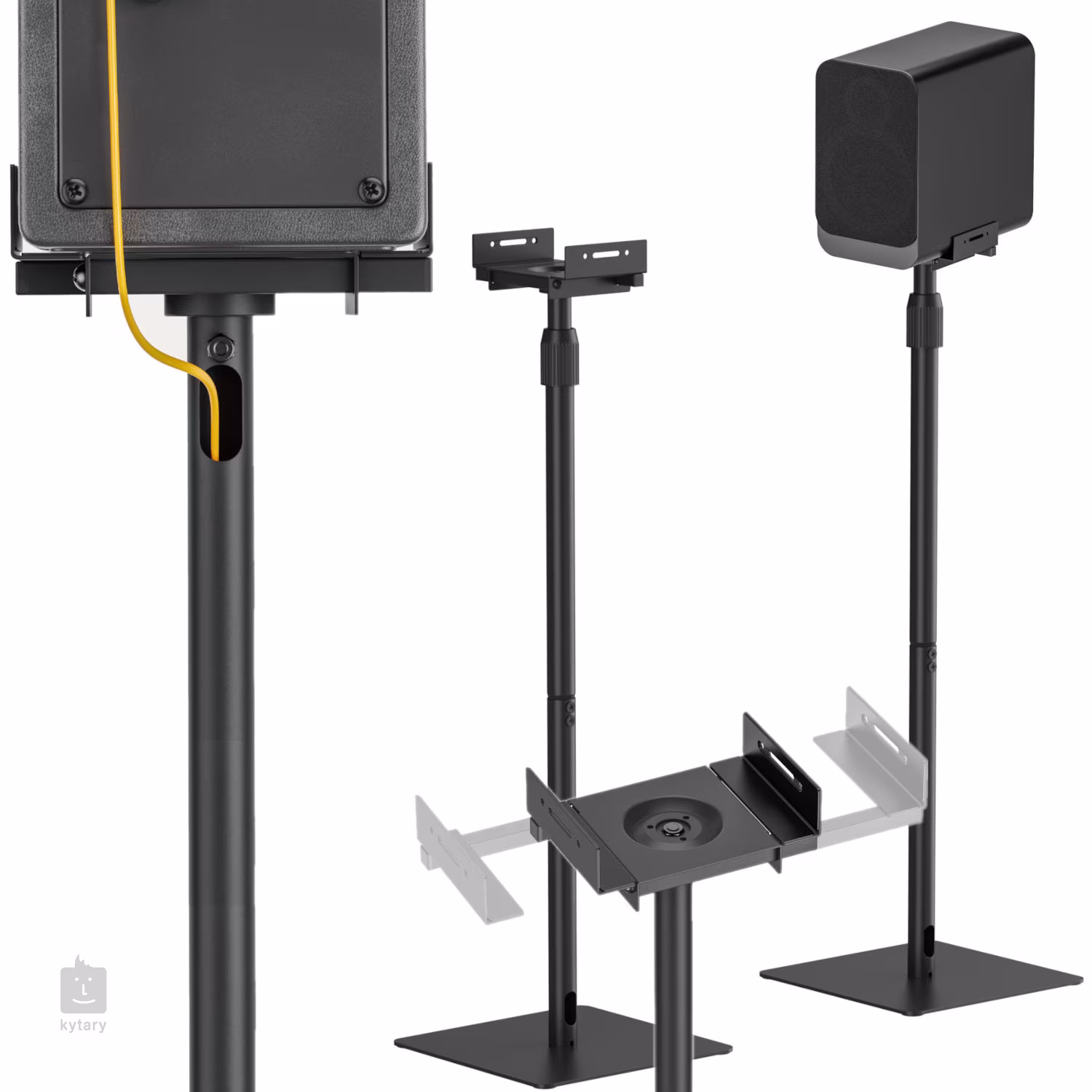 Tato sada dvou teleskopických stojanů kombinuje funkčnost, odolnost i moderní design. Nastavitelná platforma byla navržena s ohledem na maximální flexibilitu a je vybavena rozšiřitelnými svorkami a protiskluzovými podložkami na obou stranách, což zaručuje stabilní a bezpečné umístění reproduktorů různých velikostí i značek (kompatibilní se šířkami monitorů 124 – 285 mm). Základnu lze navíc otáčet o 360° a naklápět o 10° vertikálně i horizontálně, takže můžete najít dokonalý poslechový "sweet spot".