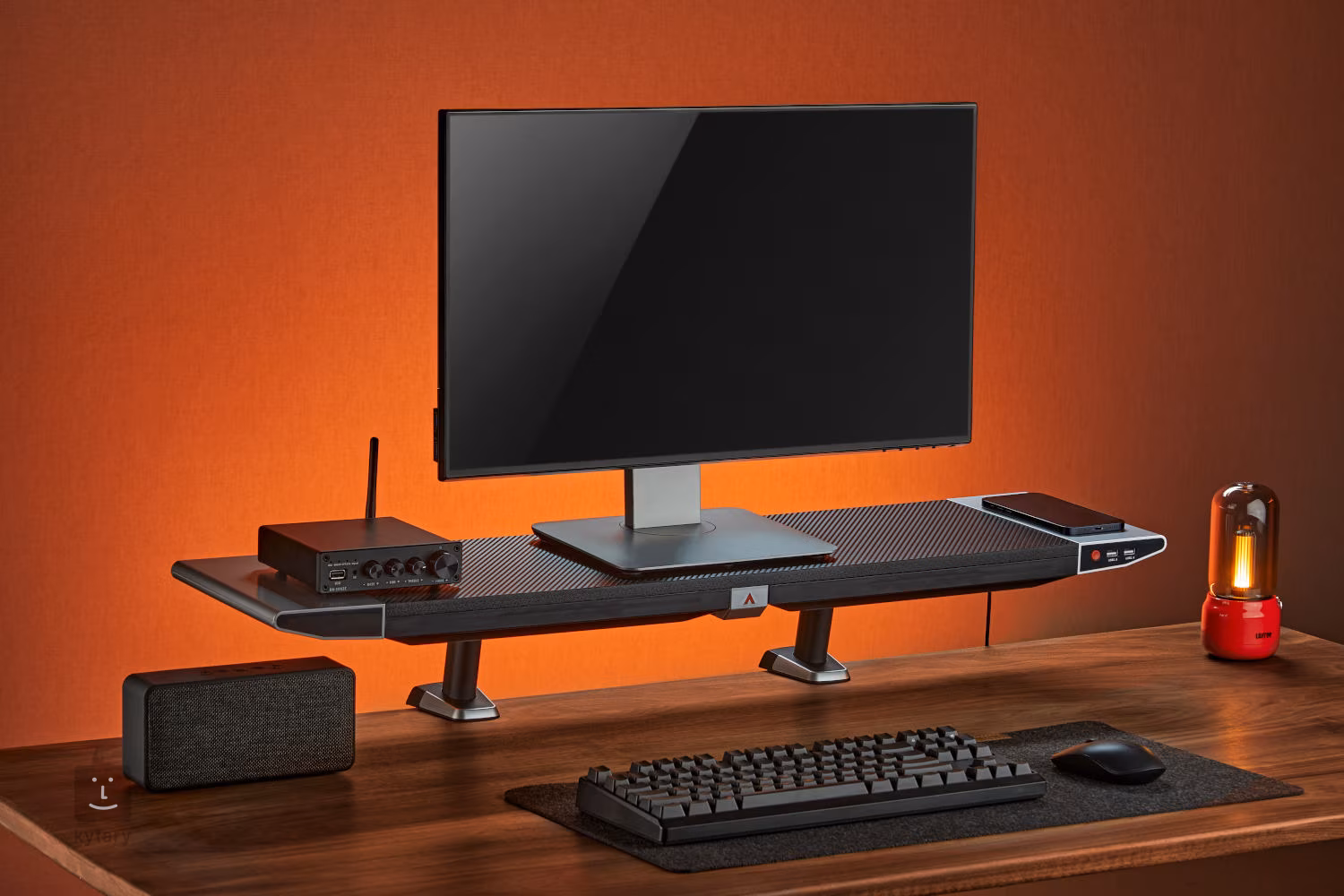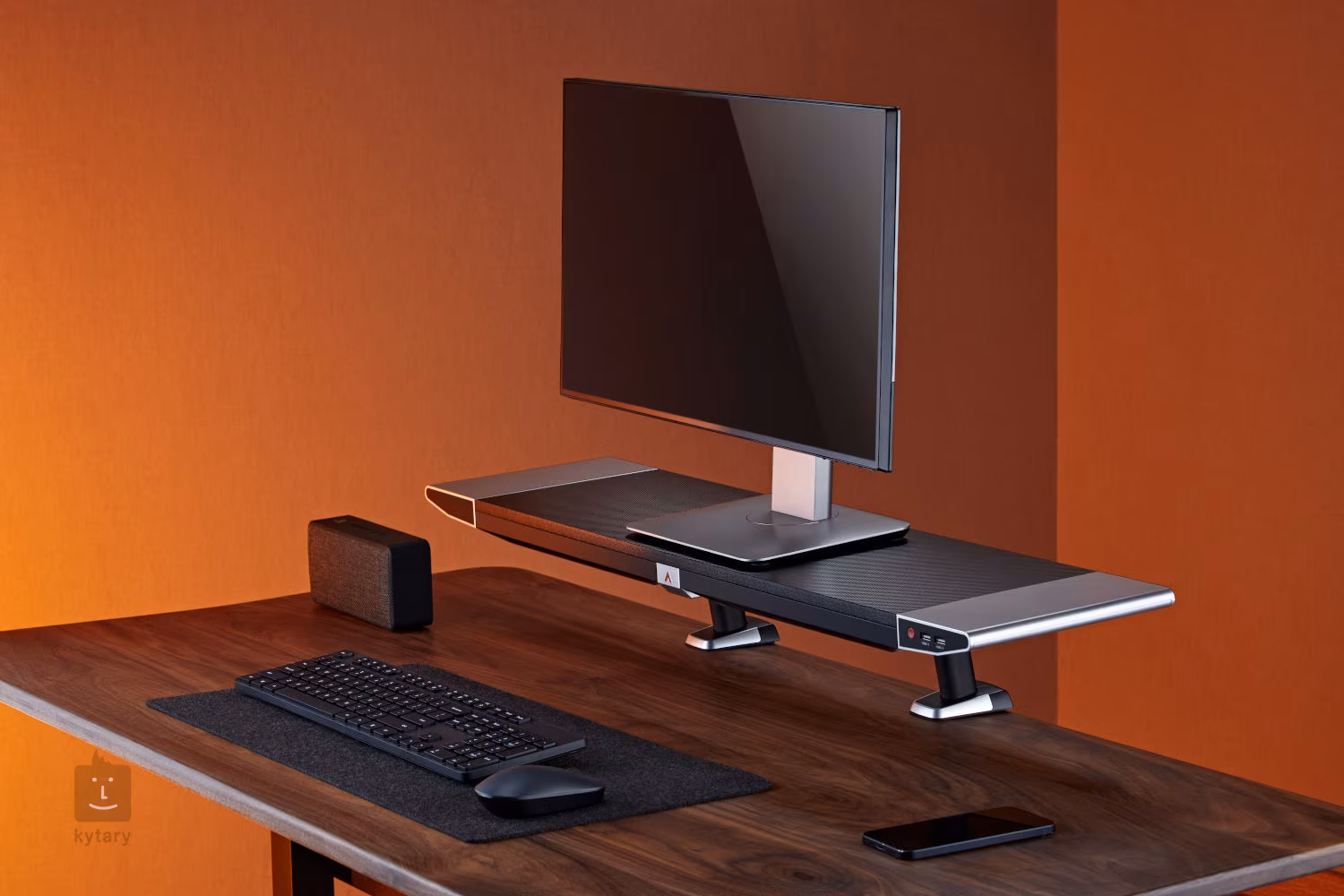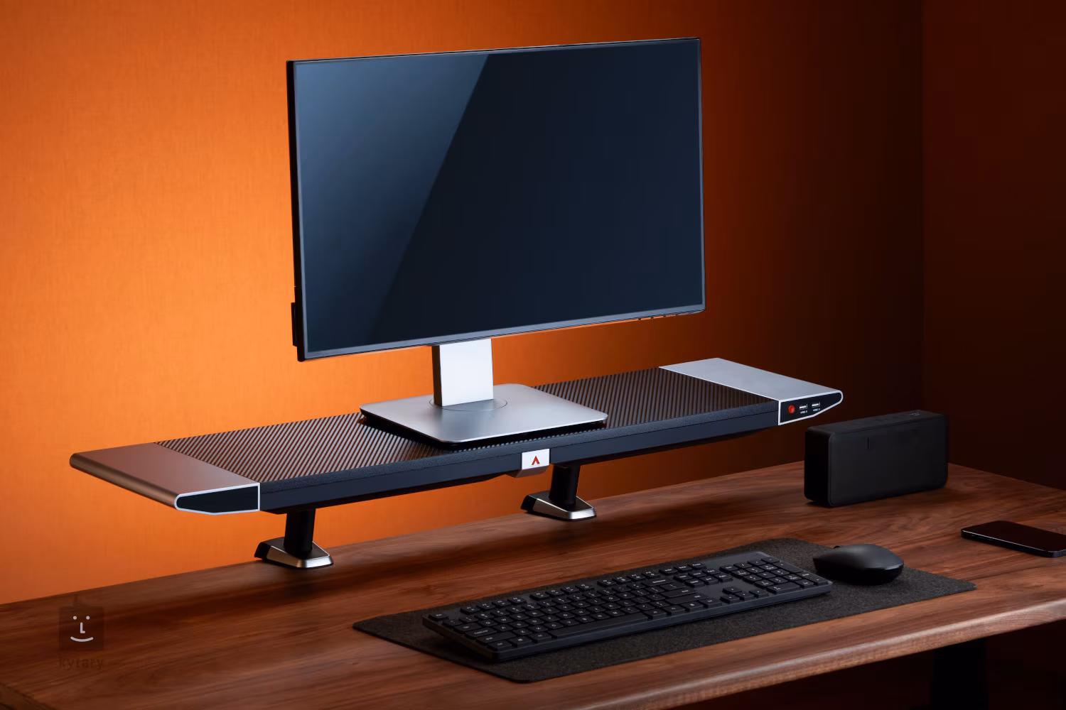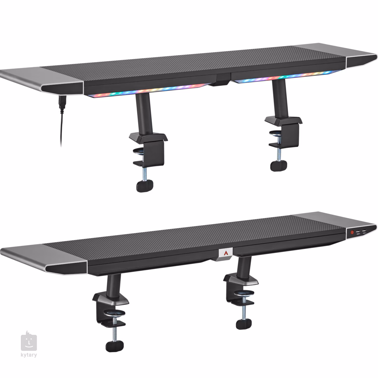 Stojan na herný monitor s podsvietením RGB, nosnosťou 20 kg, zásuvkou na drobné príslušenstvo a portami USB: 2 porty USB 2.0/2 porty USB 3.0.