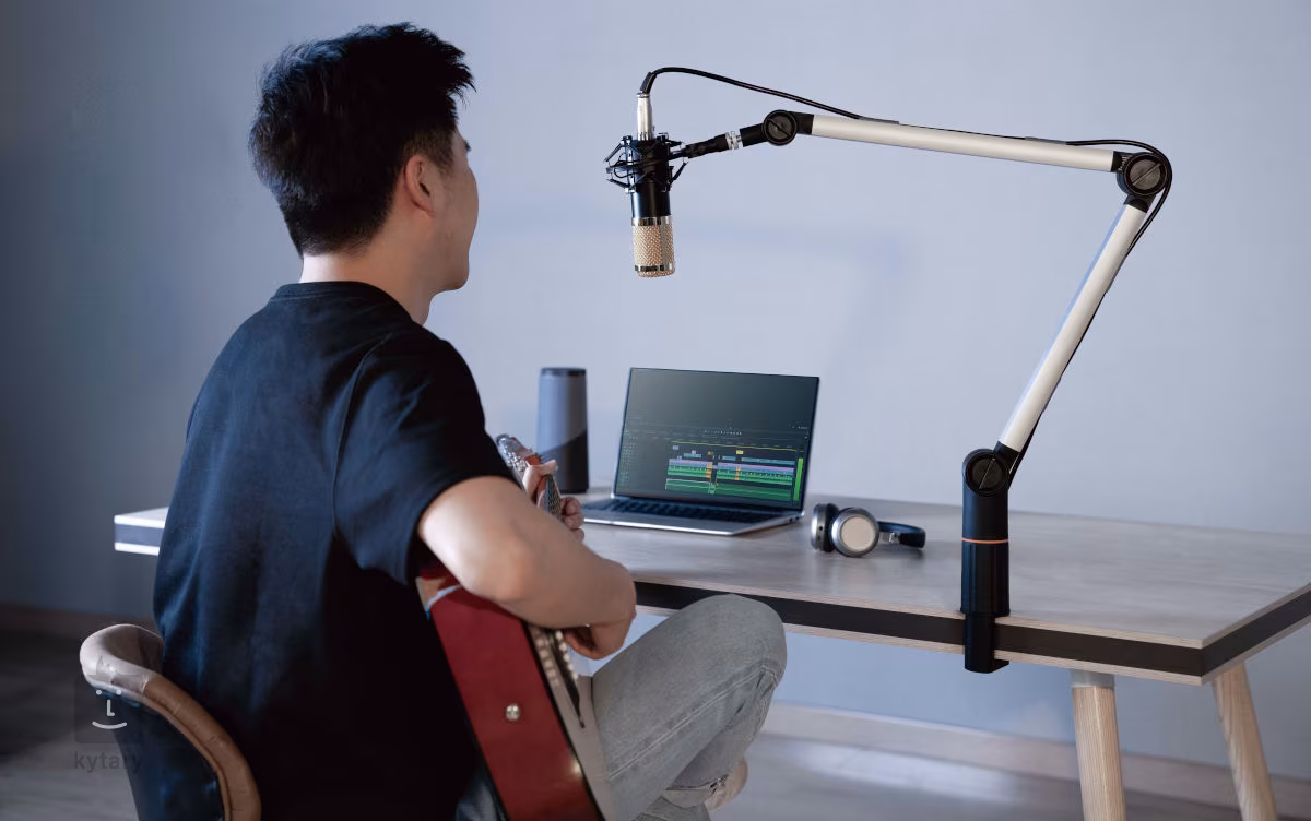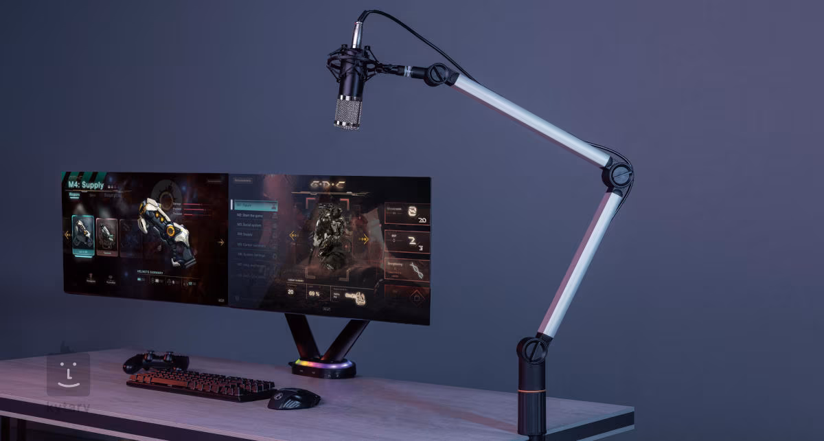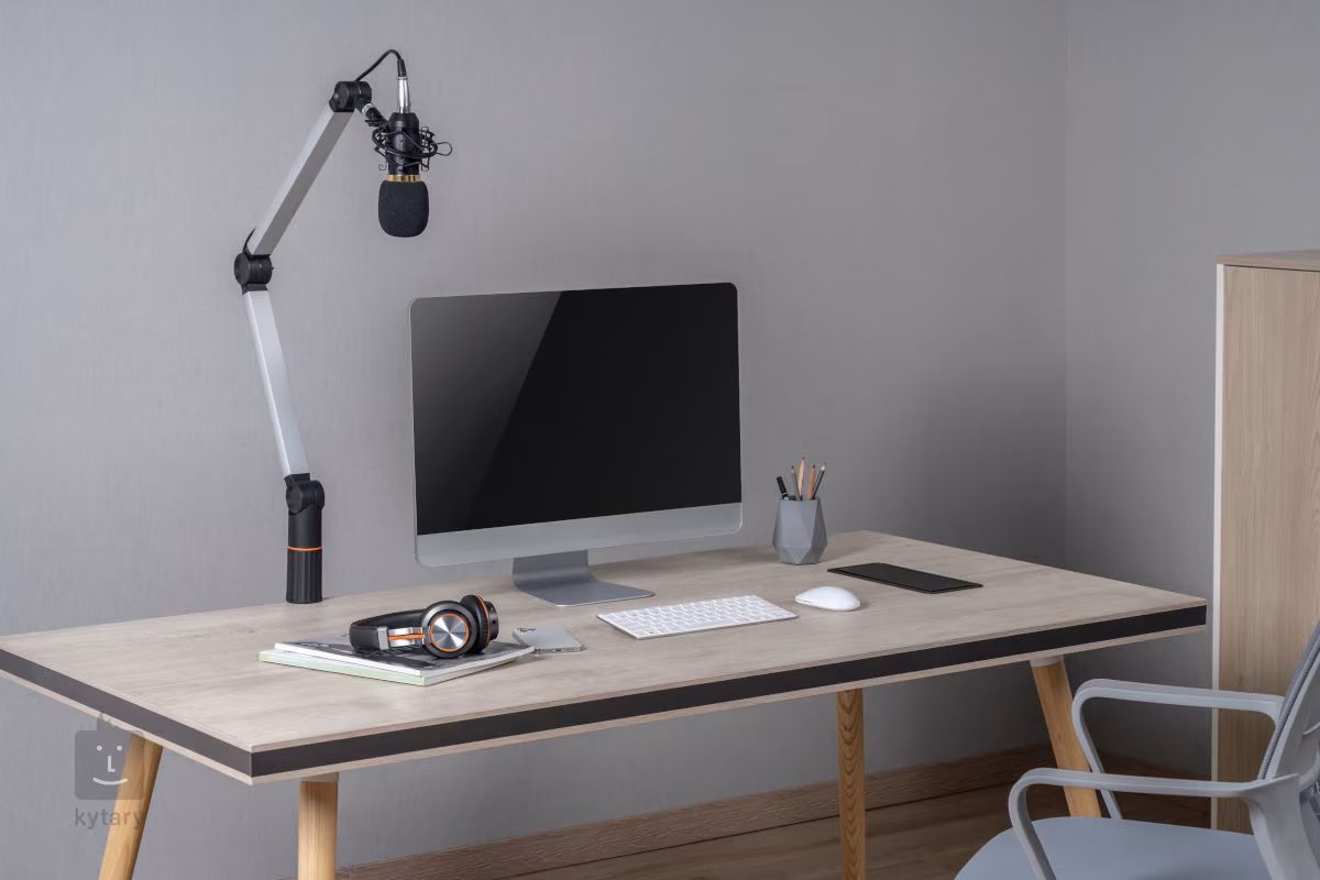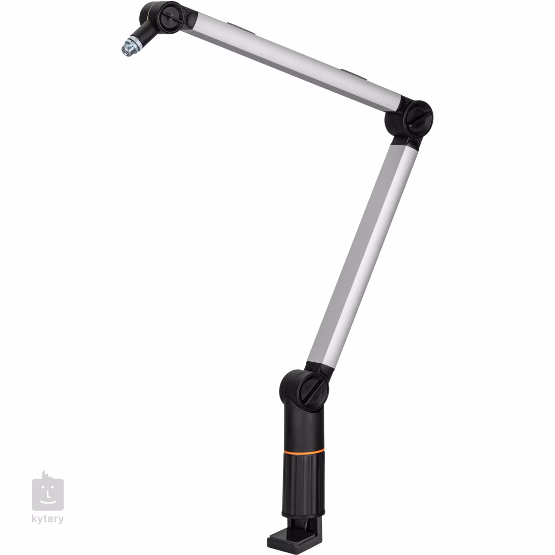 Prvotriedny mikrofónový stojan vhodný pre všetkých kreatívcov a zvukových nadšencov, ako aj pre študentské rádio, živé vysielanie alebo youtubing. Stojan je vyrobený z kombinácie ocele, plastu a hliníka, má integrovaný manažment káblov, možnosť otáčania o 360 stupňov a v neposlednom rade pohodlné nastavenie sklonu a výšky. Stojan sa upevňuje pomocou závitu na dosku stola s výškou do 60 mm. Súčasťou balenia je redukcia so závitom 5/8".
