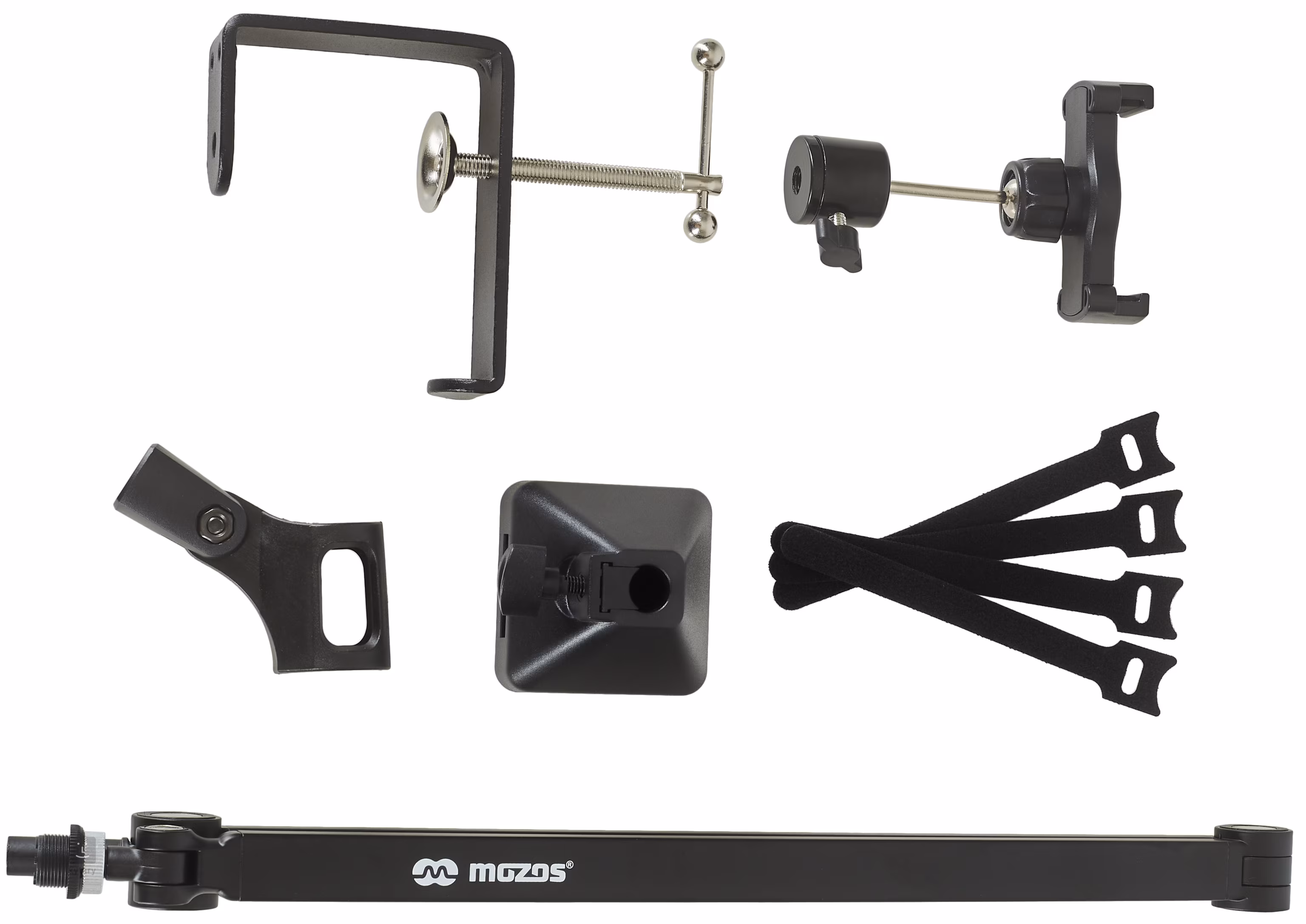 Stolný mikrofónový stojan Mozos SB42 s kovovou konštrukciou ponúka nosnosť až 2 kg, t. j. možnosť pracovať s profesionálnymi mikrofónmi, upevnenie na dosku stola so šírkou až 7 cm, flexibilitu ramena s dĺžkou 40 + 40 cm a širokú sadu príslušenstva (štyri popruhy na suchý zips, držiak na mikrofón, držiak na telefón).