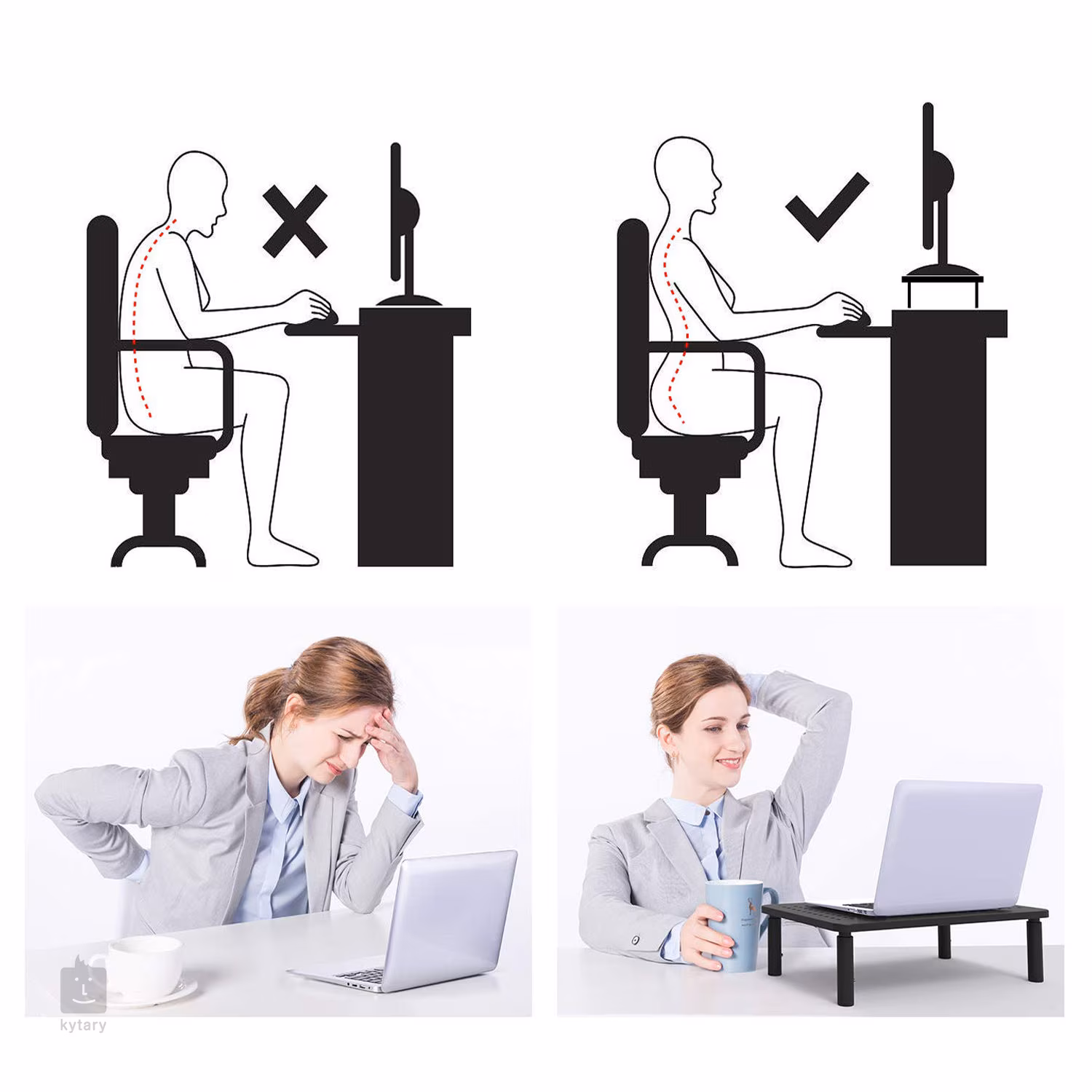 Kľúčové vlastnosti > Zvýšenie monitora do optimálnej výšky pomáha odľahčiť krčnú chrbticu a zvyšuje pohodlie počas dlhých hodín práce. Výška je nastaviteľná v troch stupňoch > Jednoduchý, ale efektívny dizajn - minimalistický vzhľad sa hodí do každého prostredia, či už ide o kanceláriu alebo domácnosť > Praktické usporiadanie - voľný priestor pod základňou využijete na klávesnicu, myš alebo dokumenty, čím ušetríte miesto na stole > robustnosť a stabilita - konštrukcia z kvalitných materiálov zaručuje dlhú životnosť a bezpečné používanie > všestranné použitie - ideálne nielen pre monitor alebo notebook, ale aj pre iné zariadenia, ako sú reproduktory alebo dekorácie