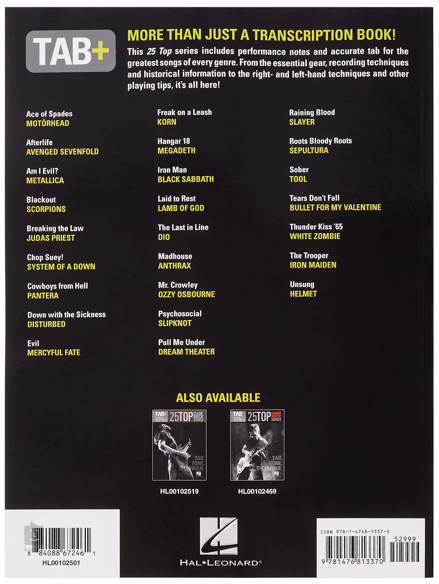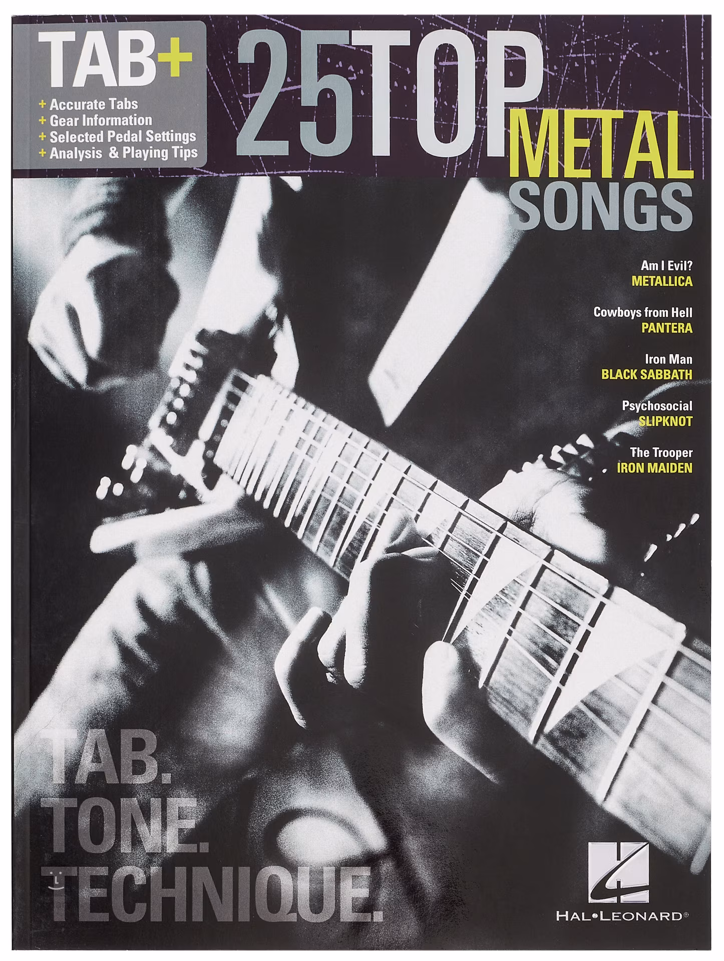 Publikácia 25 najlepších metalových skladieb - Tab. Tone. Technique. obsahuje noty na interpretáciu a presné gitarové tabulatúry dvadsiatich piatich hitov známych kapiel, ktoré patria do kategórie Hard a Heavy. Nájdete tu všetko od popisu gitarového vybavenia, techniky nahrávania a historických informácií až po techniku ľavej a pravej ruky a ďalšie užitočné rady.