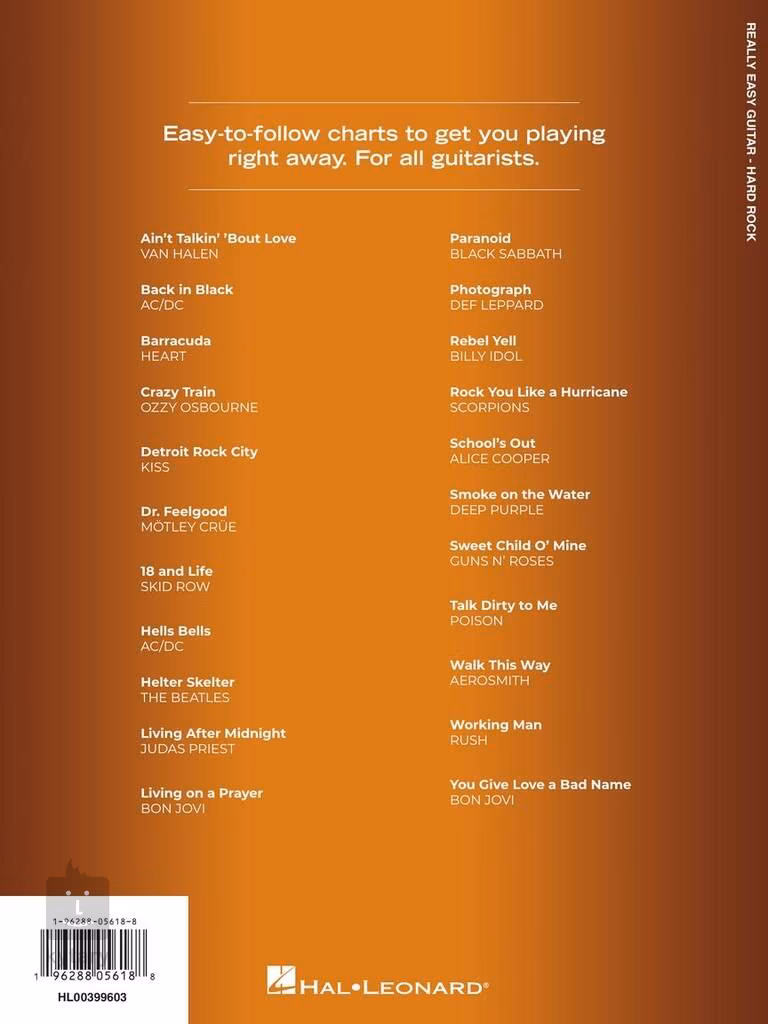 Aj ako začínajúci gitarista si môžete zahrať svoje obľúbené skladby od AC/DC, KISS, Black Sabbath, Ozzyho, Deep Purple, Bon Jovi, Poison a mnohých ďalších slávnych interpretov s Hard Rock - Really Easy Guitar. Obsahuje všetko, čo potrebujete - zjednodušené akordové sprievody, gitarové tabulatúry a texty piesní.