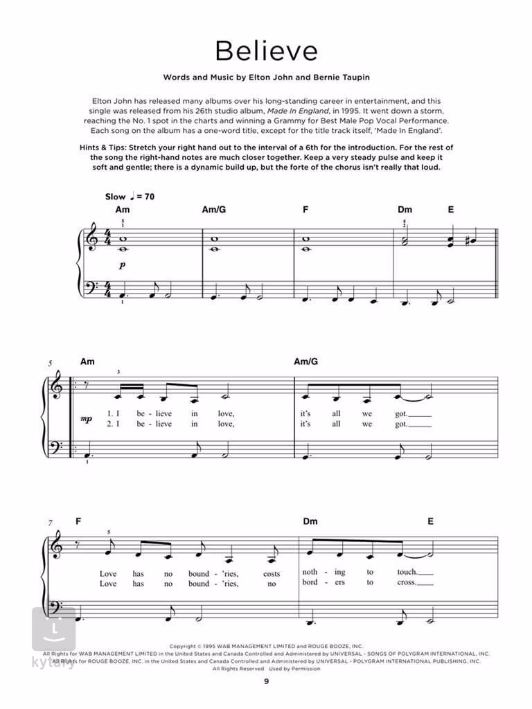 REALLY EASY PIANO: 40 ELTON JOHN SONGS obsahuje najpopulárnejšie hity anglického speváka, klaviristu a skladateľa Eltona Johna v jednoduchých "ľahko hrateľných" úpravách pre klavír s poznámkami a užitočnými tipmi, ako každú skladbu zahrať.