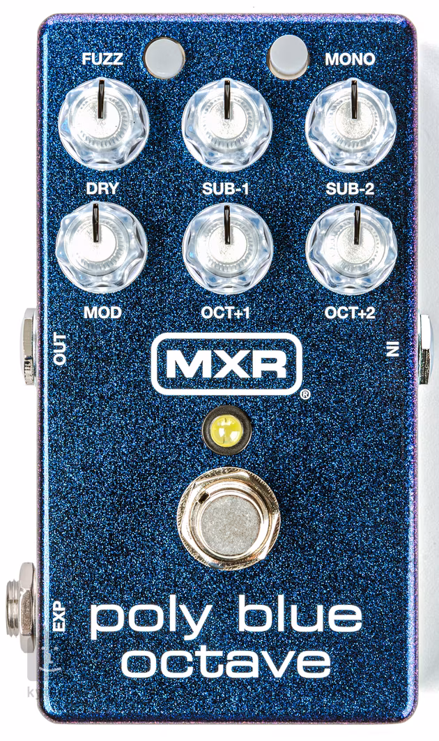 Krabička však ponúka aj monofónny režim s teplým analógovým zvukom pitch-shifteru - takže sub oktávy dostanú teplú atmosféru podobnú zvuku pedálu MXR Vintage Bass Octave, zatiaľ čo horné oktávy pre zmenu dostanú charakter krabičky Octavio Fuzz s fuzzom stiahnutým dozadu. A keď už hovoríme o fuzze - Poly Blue Octave vo svojom šasi ukrýva aj fuzz efekt inšpirovaný MXR Blue Box Fuzz. Efekt sa aplikuje na všetkých päť signálov pedálu a hlasitosť fuzz efektu nastavíte pomocou ovládača Dry po stlačení a podržaní tlačidla Fuzz.