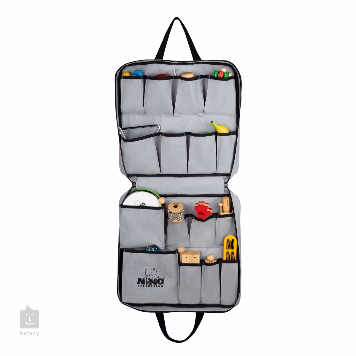 Perkusná súprava NINOSET17 od Nino Percussion obsahuje štyri rôzne farebné rumbakoule/maracas (NINO569), štyri rôzne farebné shakery (NINO540), tri páry drevených claves v prírodnom prevedení a zelenej a červenej farbe (NINO502), drevený rytmický nástroj woodpecker/datel (NINO519), drevený guiro shaker (NINO520), Apple Shaker (NINO596), Banana Shaker (NINO597), tamburína/žingelová palička (NINO13Y), 1x 6" detský bubon (NINO4GG), drevené kastanety (NINO585), energetický gong (NINO579S), perkusný nástroj cabasa (NINO701), dva triangly vo veľkosti small a medium, tamburína z ABS plastu (NINO49SB), drevený blokový perkusný nástroj (NINO21) a prepravný kufor.
