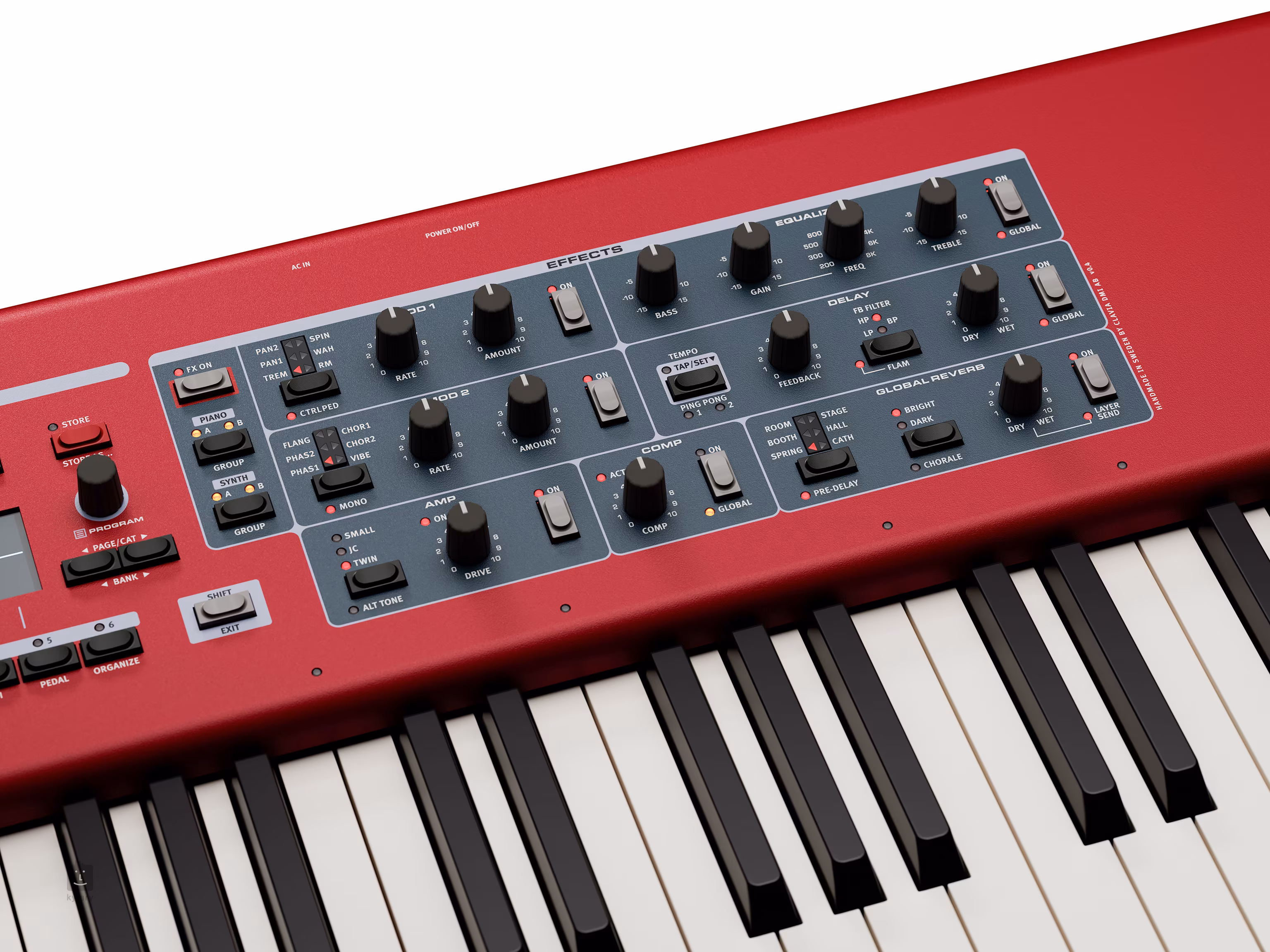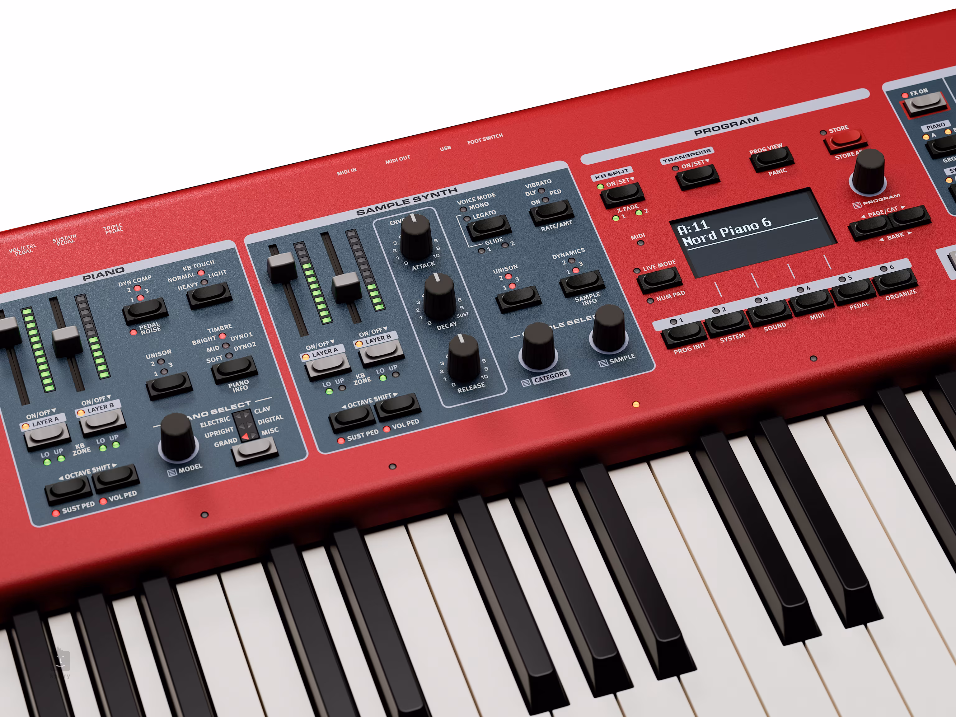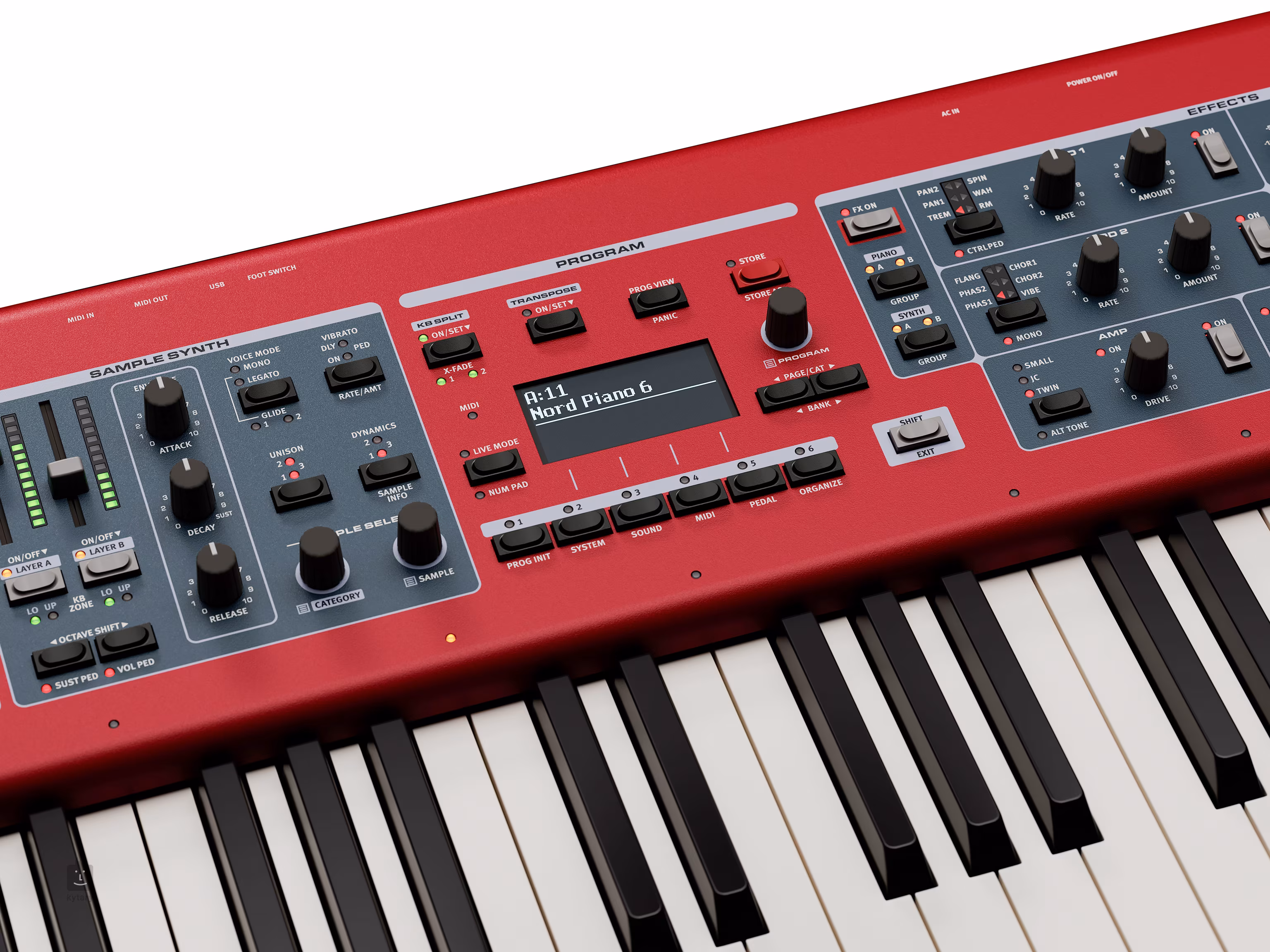 Klavírna sekcia > 2 nezávislé vrstvy > 2 GB pamäte pre zvuk klavíra > zvuky klavíra, klavíra, elektrického klavíra, digitálneho klavíra/klavíra, klavíra/klavíra a rôzne zvuky > pokročilá simulácia rezonancie strún pre Grand a Upright > ovládanie farby klavíra s vlastnými nastaveniami pre elektrické klavíry a clavinet > funkcia Pedal Noise s podporou Nord Triple Pedal 1, Nord Triple Pedal 2 alebo Nord Single Pedal 2 pre akustické a elektrické klavíry > možnosť nahradiť zvuky pomocou aplikácie Nord Sound Manager (Mac/Win) > 120 hlasov polyfónie > filtre Soft, Mid, Bright a Dyno > Dynamická kompresia > funkcia Unison > 3 nastaviteľné citlivosti klaviatúry