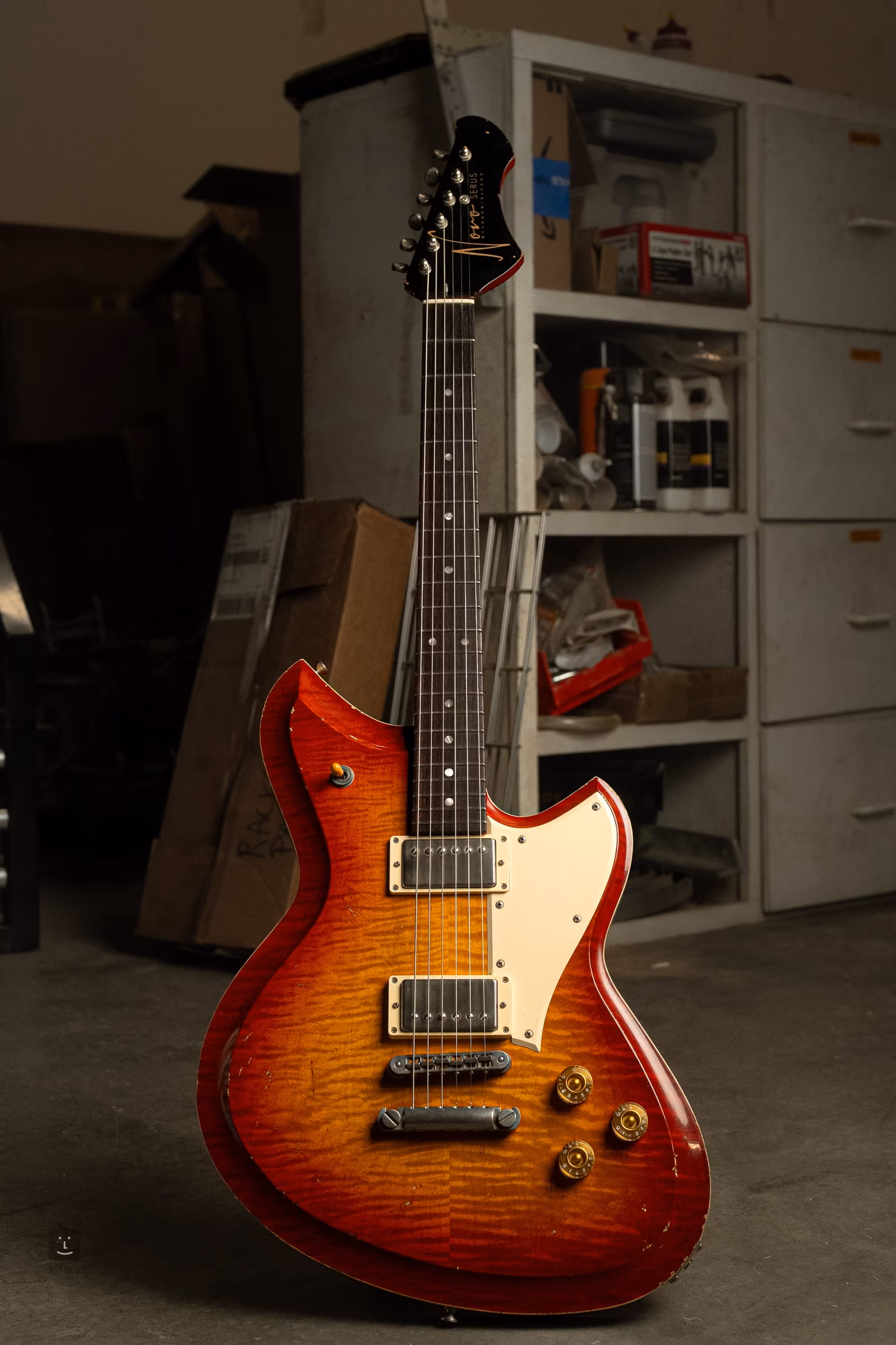 Vzhľad boutiqueovej elektrickej gitary Chambered Serus H2 Dealer LTD 2026 Faded Cherry Burst navrhol renomovaný americký výrobca gitár Dennis Fano, majiteľ značiek Fano a Novo Guitars.