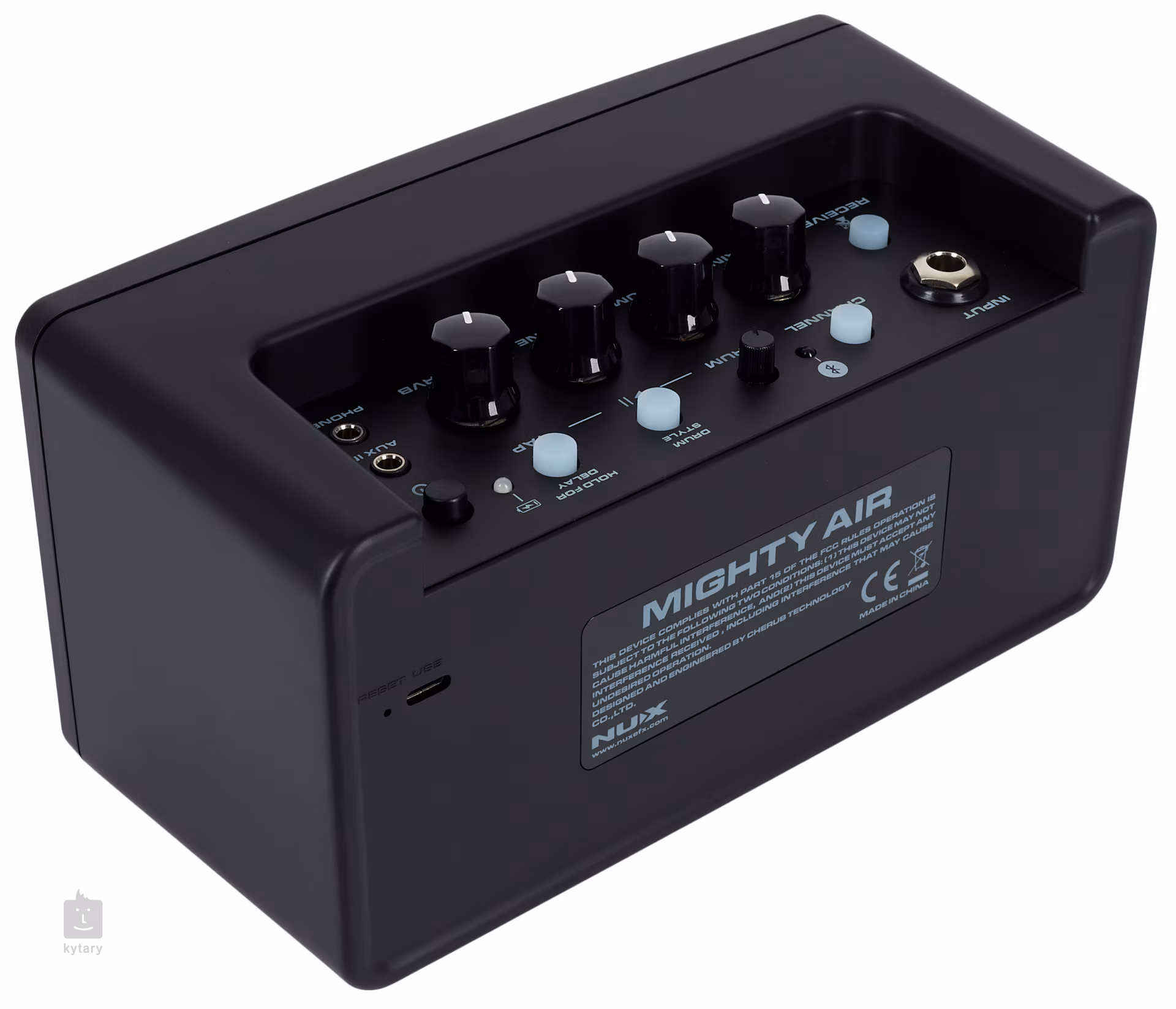 NUX Mighty Air je bezdrôtový stereo modelingový kombo pre gitaru a basgitaru s výkonom 2x 4 watty a kompatibilitou s Bluetooth, ideálny na cvičenie doma, ako zariadenie na rozohriatie pred koncertom alebo všeobecne ako spoločník na cestovanie. Ponúka dva režimy – továrenské nastavenie pre gitaru so štyrmi kanálmi (Clean, Overdrive, Distortion, Acoustic Guitar Simulator) a pre basgitaru s tromi kanálmi Pop, Rock, Funk (prepínanie režimov cez aplikáciu Mighty Amp na vašom telefóne/tablete), vstavané efekty reverb a delay, automatický bubeník s výberom rôznych štýlov (10 štýlov plus metronóm), Aux In pripojenie pre externé audio zdroje, výstup pre slúchadlá a Micro USB pre nabíjanie zosilňovača/nahrávanie aktualizácií.