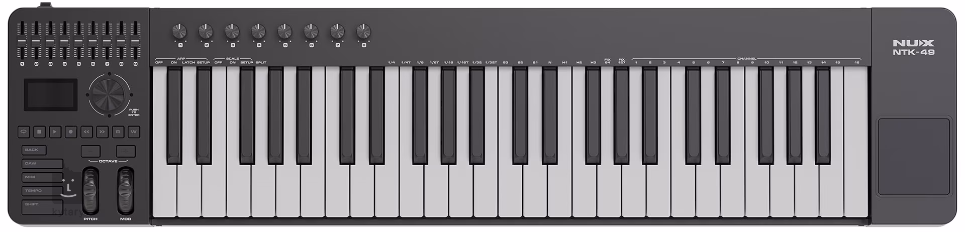 Multifunkčný MIDI kontrolér NUX NTK-49 je vhodný na integráciu a prácu v rámci DAW. Ponúka intuitívne ovládanie populárneho softvéru, ako sú Cubase, Logic Pro a Pro Tools, prostredníctvom protokolov Mackie, Hui a CC, pričom poskytuje základné mixážne funkcie v kombinácii s 9 fadermi, transportnými tlačidlami, 8 enkodérmi a možnosťami ovládania pluginov.