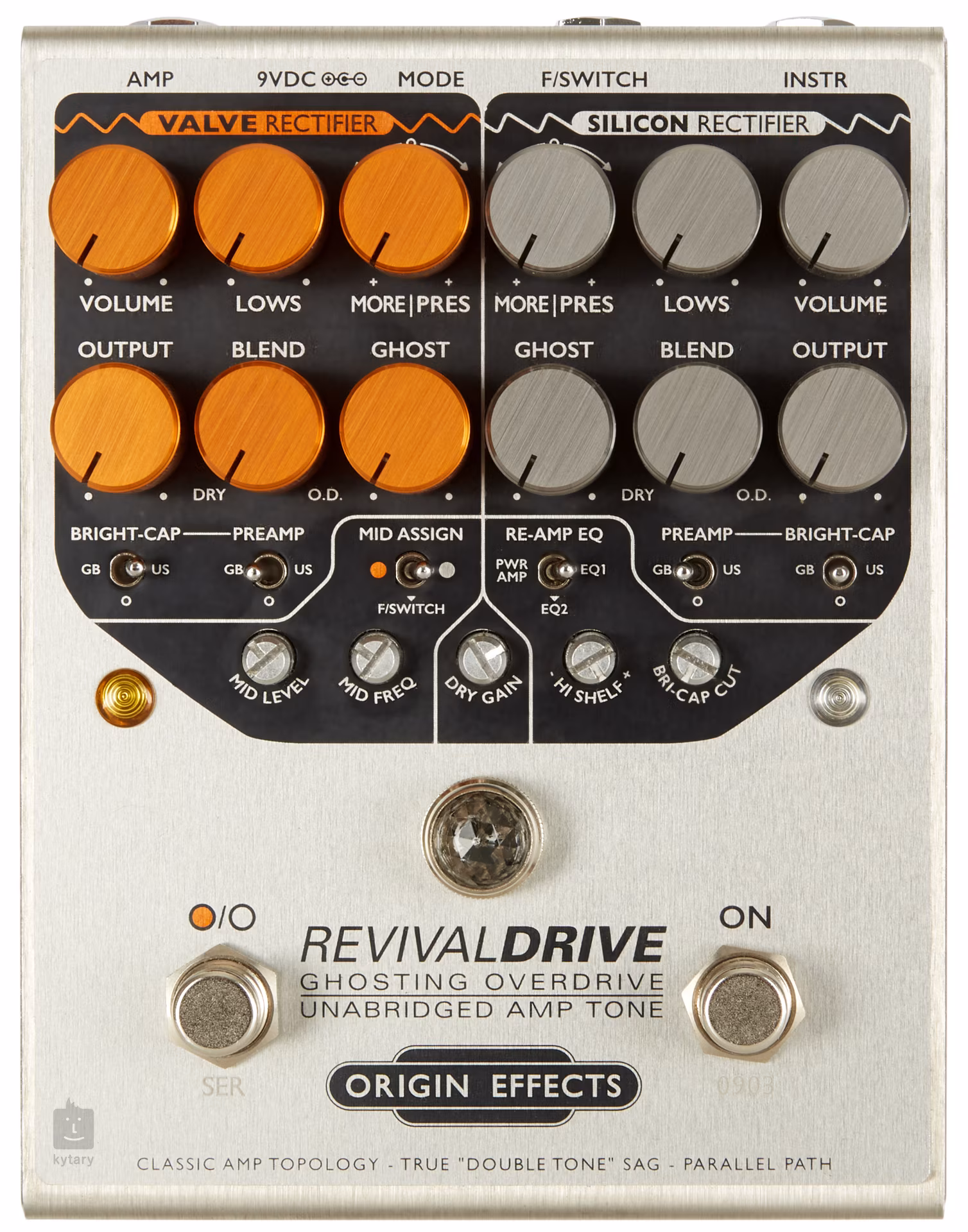 RevivalDrive je dvojkanálový overdrive efekt inšpirovaný vintage lampovými aparátmi bez Master Volume a ich obvodov, pretože - povedzme si na rovinu - ťažko vymyslieť niečo lepšie. S použitím čisto analógových komponentov replikuje všetky úrovne obvodov lampových zosilňovačov, t. j. predzosilňovače triedy A oboch kanálov, fázový menič, koncový stupeň push-pull, usmerňovače (lampový a polovodičový - kanály Valve a Silicon Rectifier) alebo zabudovanú reaktívnu záťaž, t. j. pedál modeluje interakciu medzi lampovým zosilňovačom a reproduktorom. Pojem "zosilňovač v krabičke" tak nadobúda úplne nový rozmer - vďaka širokej škále nastavení (samostatné ovládanie kanálov je doplnené množstvom ďalších miniprepínačov a prepínačov) pedál nielenže produkuje čisto britské (Marshall, Vox) a americké (Fender) zvuky na nerozoznanie od originálu, ale dokáže ovplyvniť aj tie najjemnejšie zvukové nuansy.