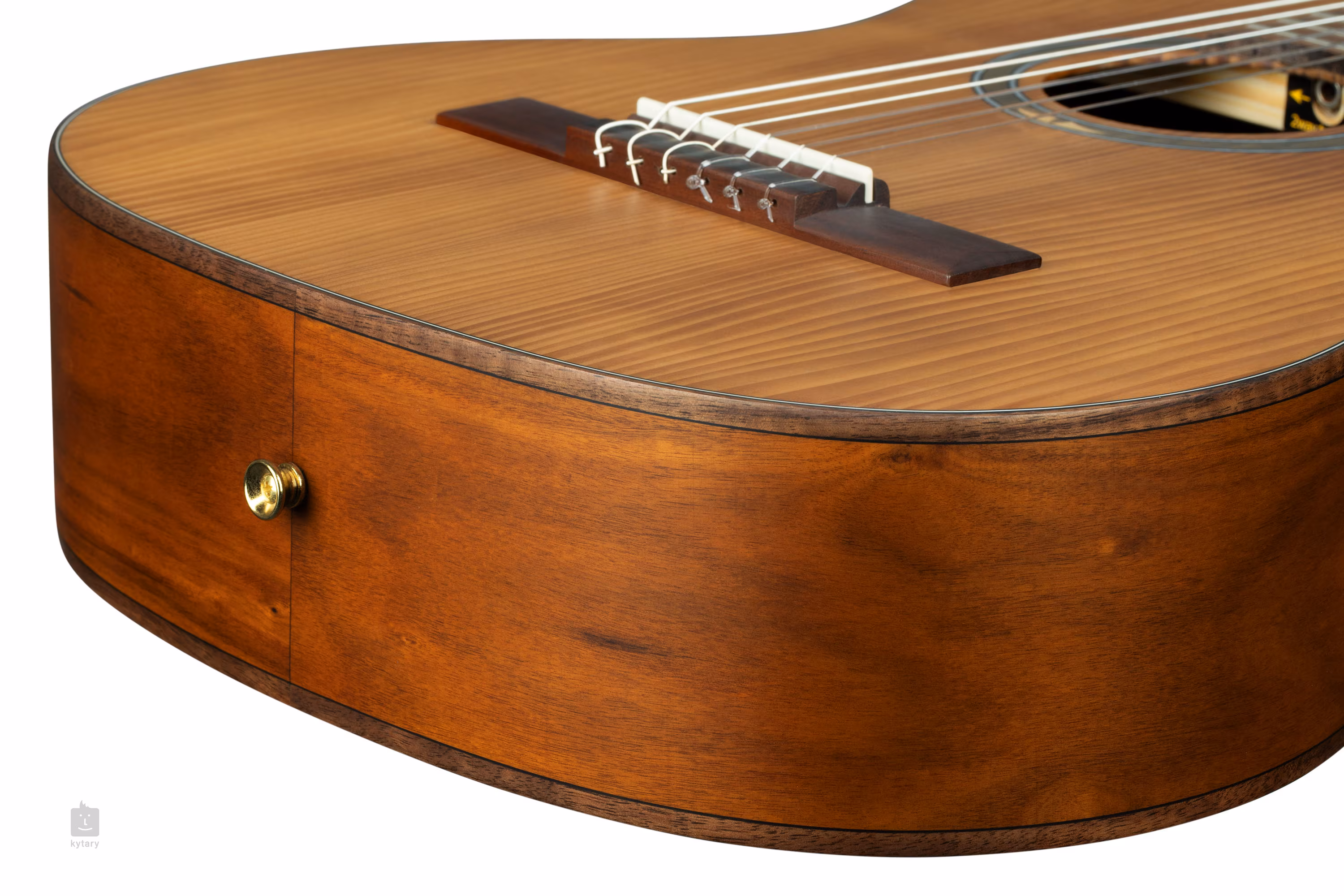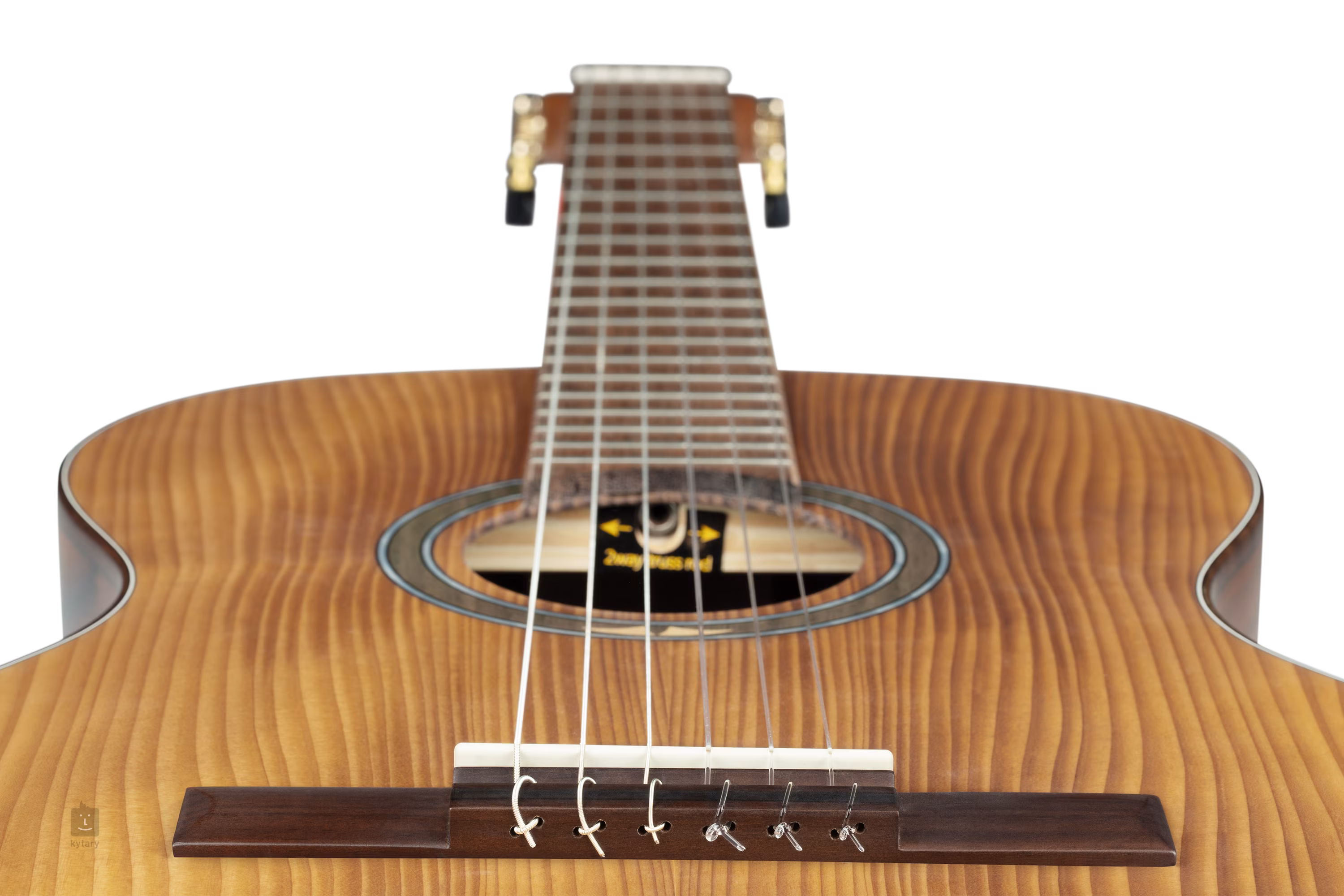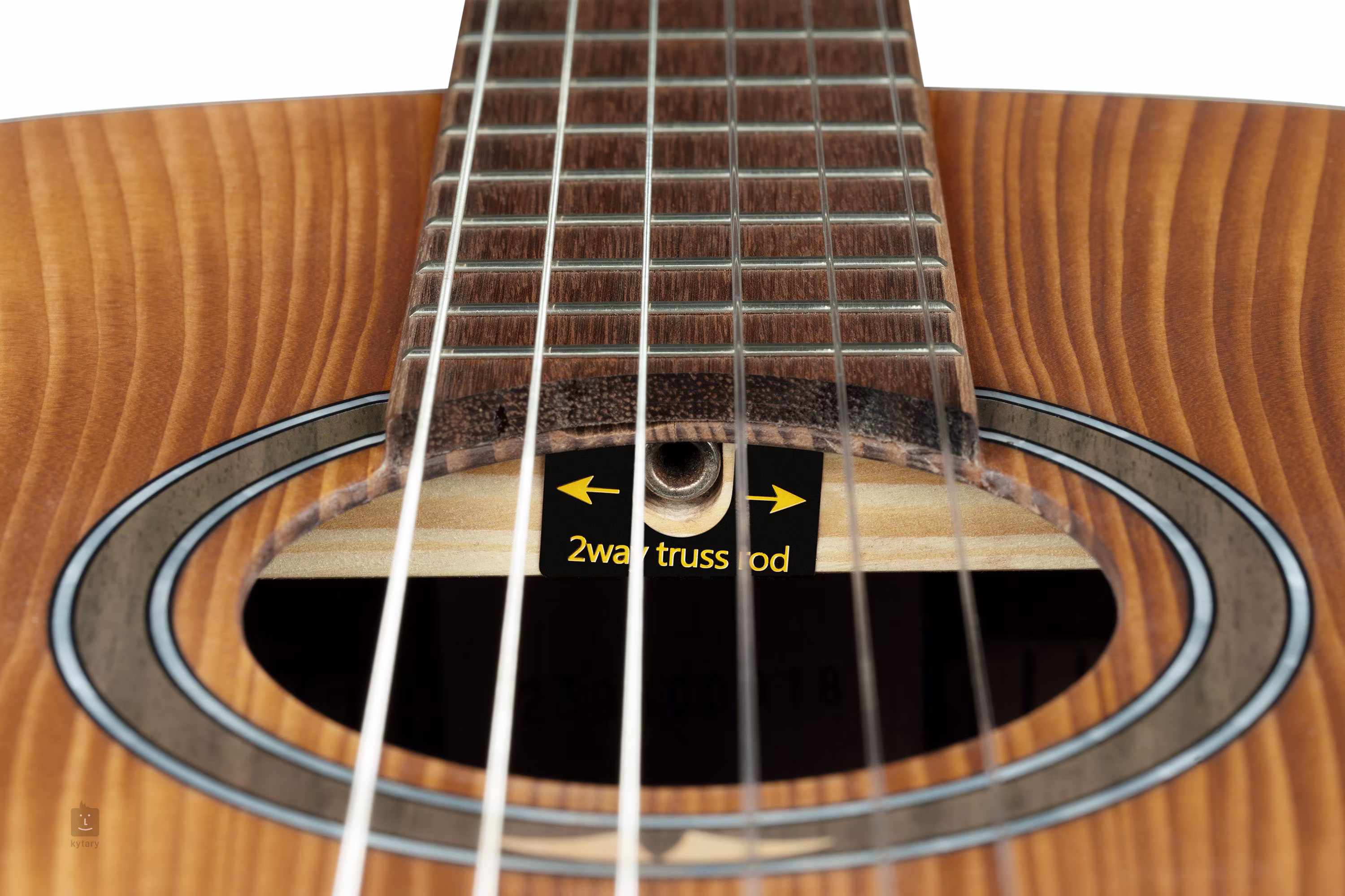 Struny sú uchytené v klasických ladiacich mechanikách a jatobovom hmatníku. Pekné spracovanie podčiarkuje matná povrchová úprava rezonančnej dosky (Satin Dark), obvodový lem tela hmatníka z orechového dreva, ozdobná rozeta a perleťové logo na hlavici.