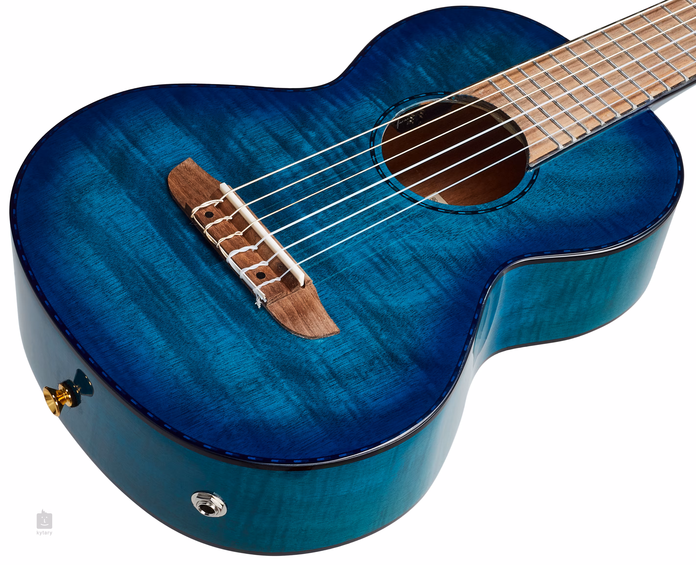 Guitalele Ortega RGLE18BLF zo série Timber je vyrobená z laminovaného mahagónu (flambovaný mahagón) s kresbou dreva podporenou efektnou povrchovou úpravou Faded Blue. K mahagónovému krku je prilepený orechový hmatník s osemnástimi pražcami. Struny sú uchytené v klasickej konštrukcii (štrbinová hlavica) a hmatník z orechového dreva.