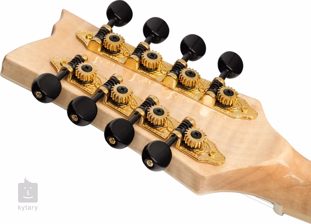 Struny sú upevnené na kostenej matici v pozlátených ladiacich mechanikách s čiernymi kolíkmi a mostíkom a strunníkom. Krásne spracovanie podčiarkuje imitácia slonovinového lemovania a ozdobná intarzia na dvanástom pražci.