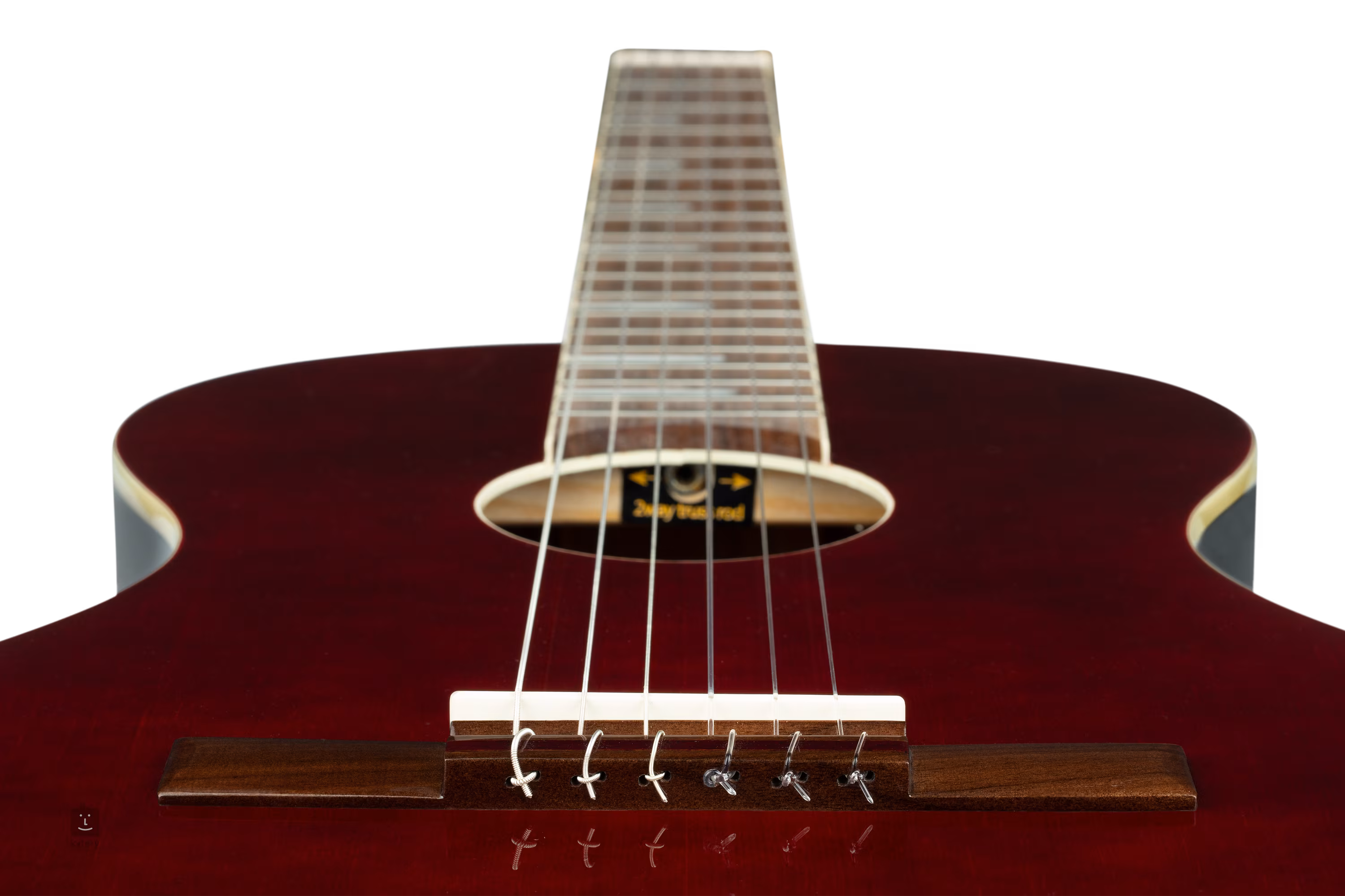 Struny držia otvorené ladiace mechaniky v zlatom prevedení a orechový hmatník nad plastovým nultým pražcom. Štýlový dizajn podčiarkuje farebná povrchová úprava rezonančnej dosky, imitácia slonovinovej kosti na tele a okolí hmatníka, perleťové polohové značky na hmatníku a logo na hlavici nástroja.