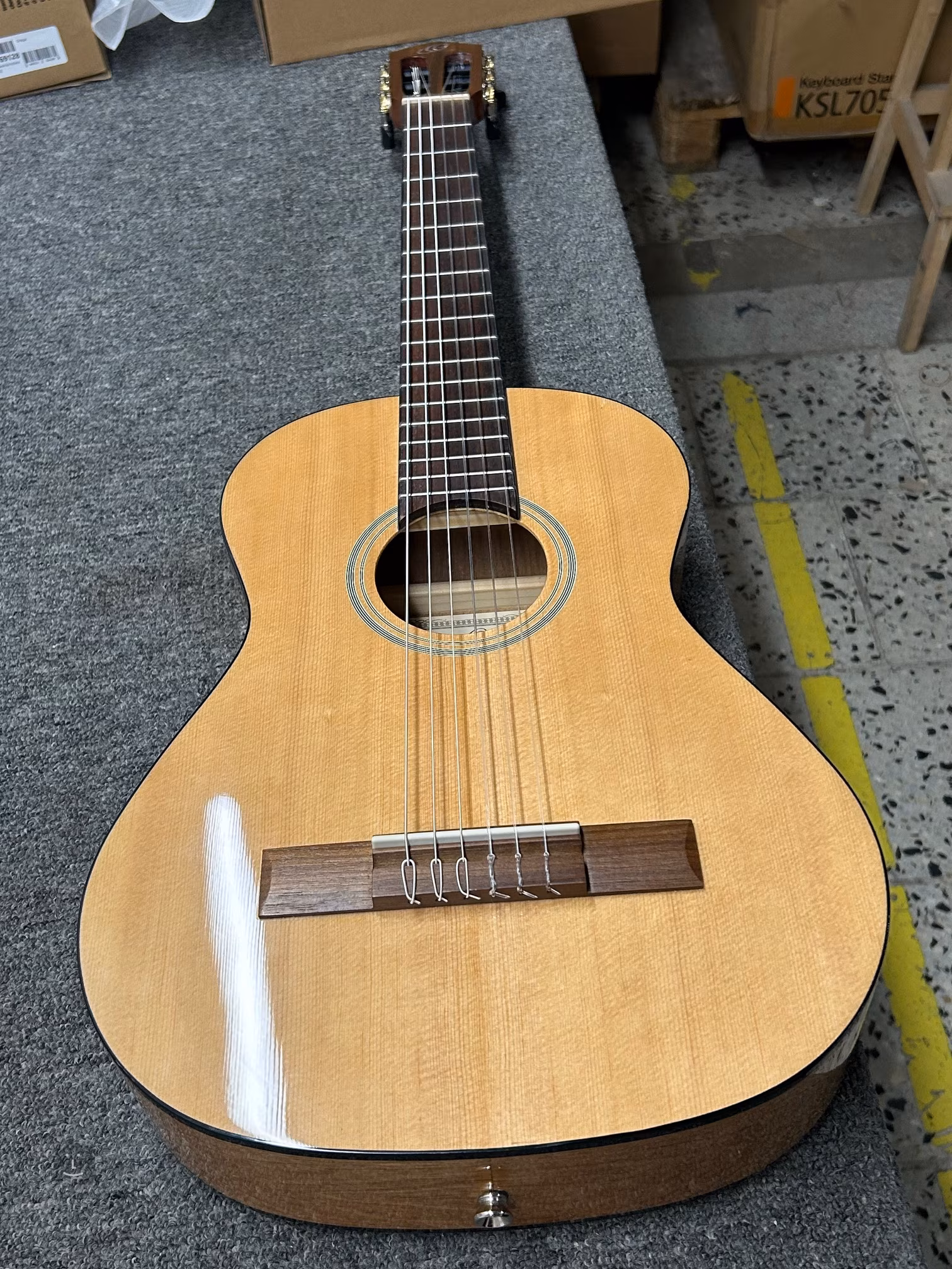 Táto klasická gitara polovičnej veľkosti je vhodná pre deti a mladých študentov hudby, ktorých menším prstom vyhovuje užší krk a kratšia menzúra gitary. Telo nástroja je vyrobené zo smrekovej a katalpovej preglejky a na mahagónový krk nadväzuje orechový hmatník s osemnástimi pražcami. Strohý dizajn je decentne ozvláštnený čiernou ABS väzbou a logom na hlavici.