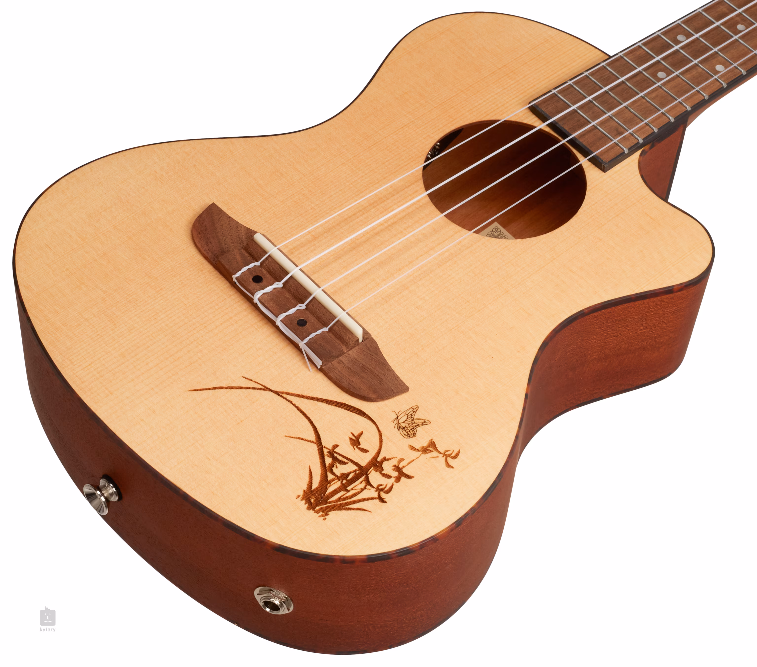 Laminované telo tenorového ukulele RU5CE-TE je vyrobené z laminovaného smreka a zadná doska a luby sú vyrobené z laminovaného sapele. Predná doska je zdobená laserovým gravírovaním, telo je obklopené ABS lištou. Na mahagónový krk nadväzuje orechový hmatník osadený osemnástimi pražcami s polohovacími bodmi, ktoré vám uľahčia orientáciu na jeho povrchu. Struny sú osadené v orechovom hmatníku a uzavretých ladiacich mechanikách gitarového typu (Die-Cast).