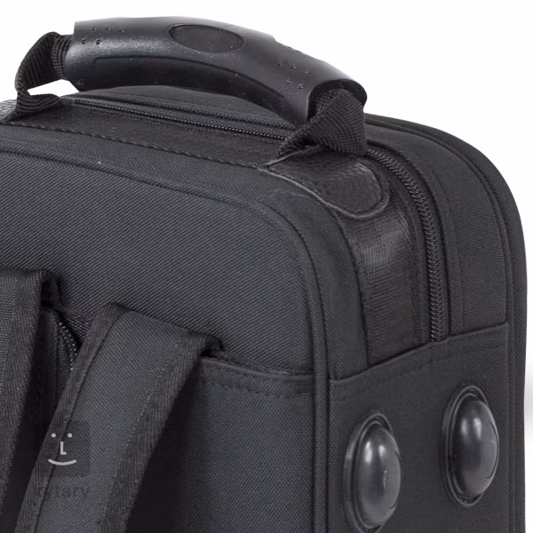 Klarinetové puzdro vyrobené z mäkčeného polyesteru. Má vonkajšie vrecko na drobné príslušenstvo, vnútorné polstrovanie, tvarovaný interiér (polyuretánová pena a ABS), velúrovú podšívku, rukoväť, ramenný popruh, zadné popruhy a zapínanie na zips.