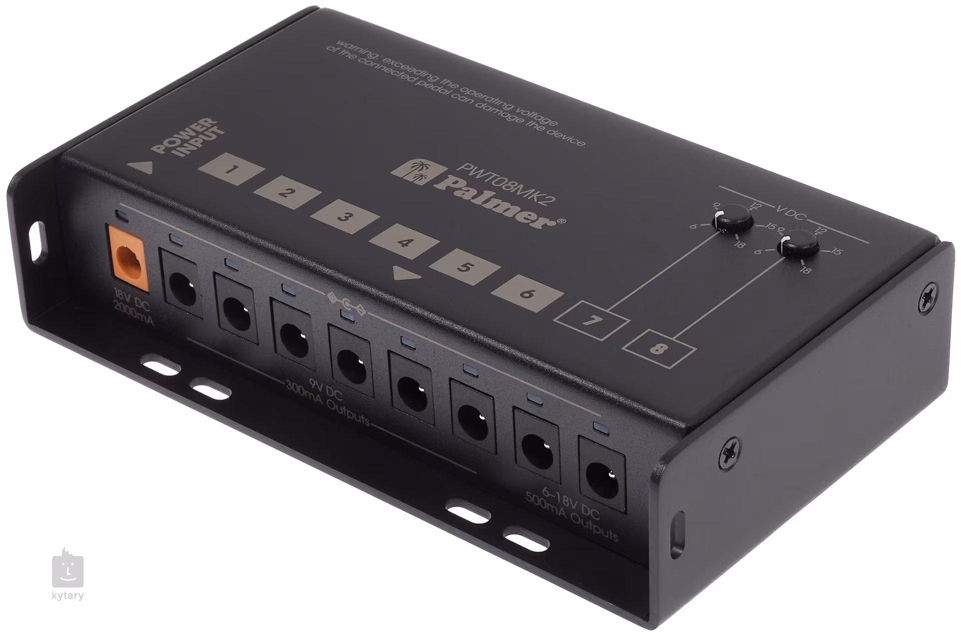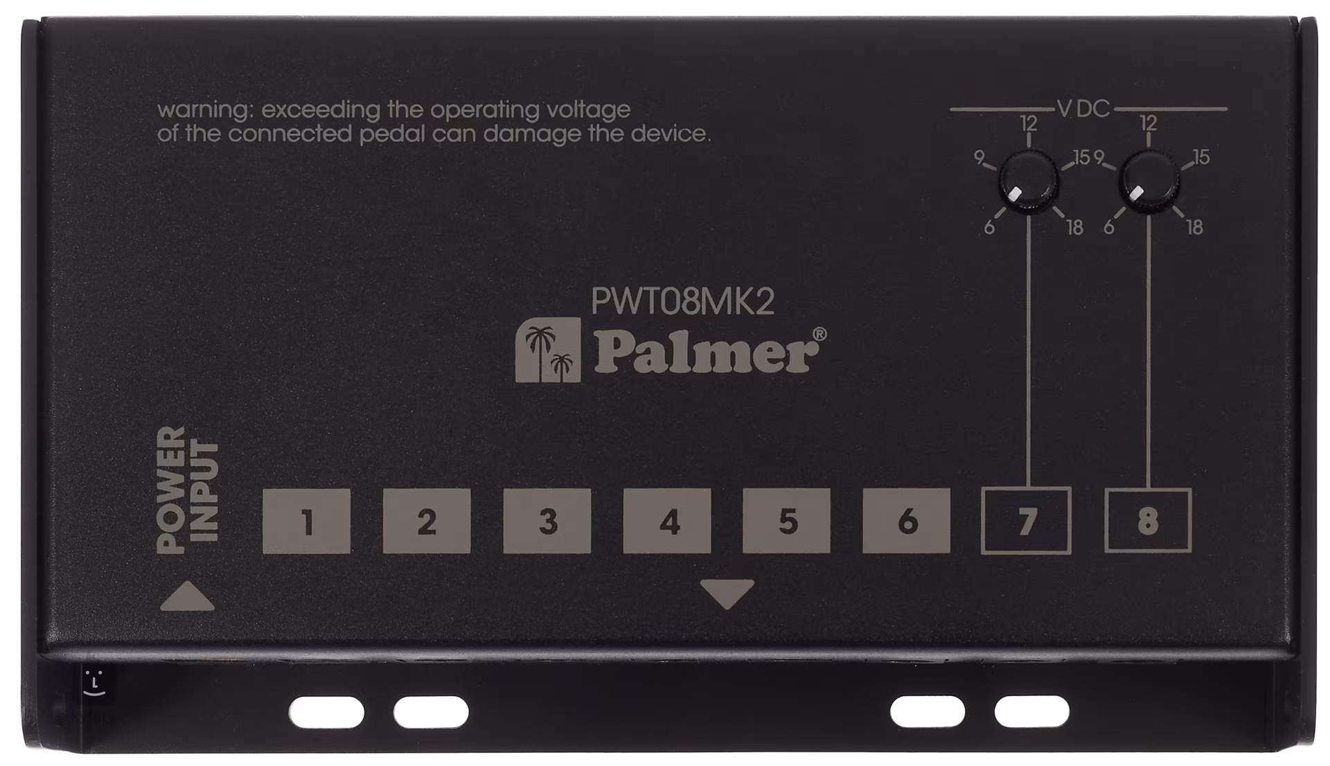 PWT 08 MK2 je univerzálny multiadaptér Palmer so šiestimi výstupmi 9 V DC s maximálnym odberom 300 mA na napájanie bežných gitarových efektov a dvoma výstupmi prepínateľnými medzi 6, 9, 12, 15 a 18 V s maximálnym odberom 500 mA. Každý z výstupov je plne izolovaný, a teda chránený proti skratu a prepätiu. Súčasťou balenia je napájací adaptér (EÚ/UK/USA), 8x DC kábel (60 cm) a štyri pogumované nožičky.