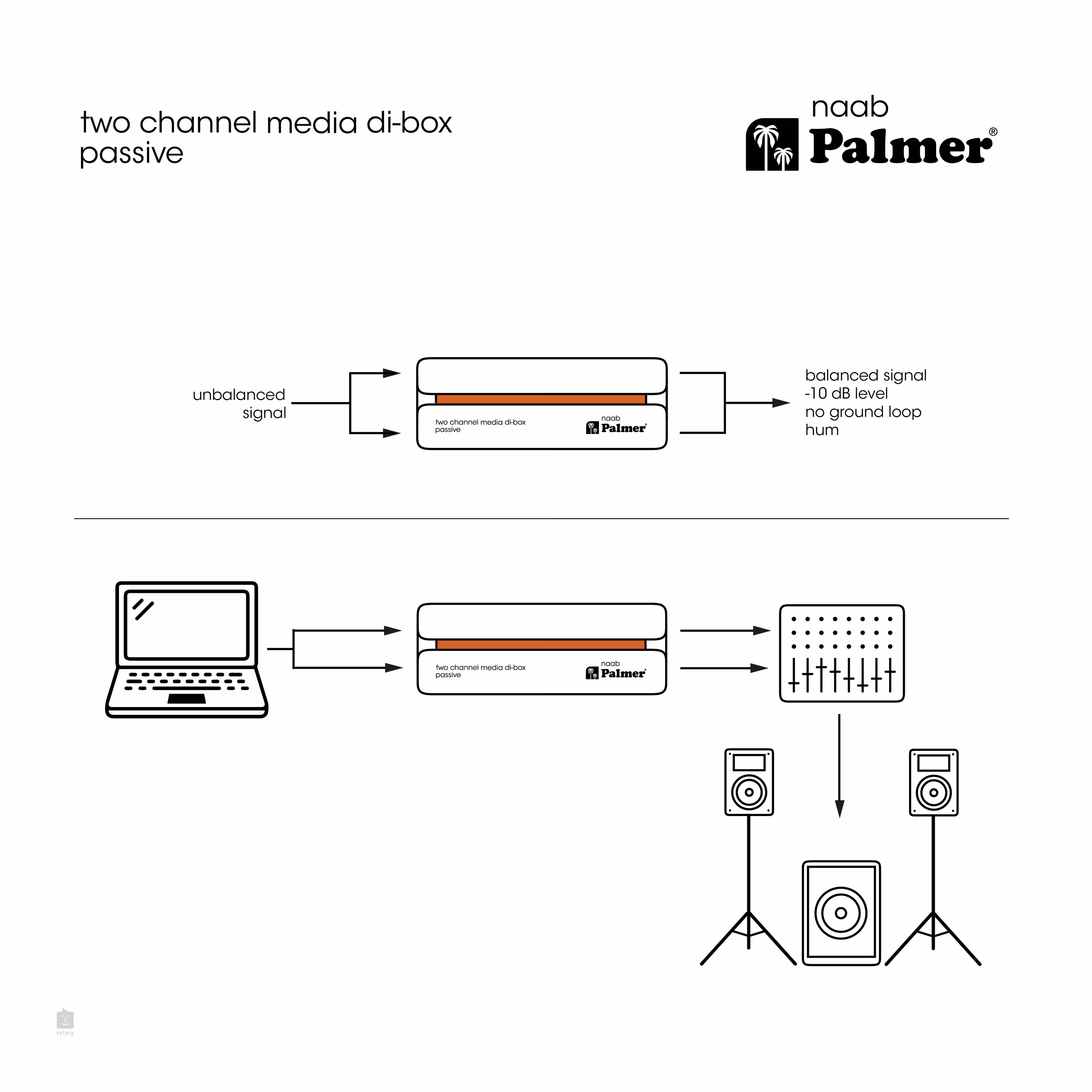 Ak pripojíte notebook k zvukovému systému, kvalita zvuku je v mnohých prípadoch veľmi nízka. Šum, praskanie a niekedy aj strata frekvencií v okrajových pásmach. Spoľahlivým riešením tejto situácie je dvojkanálový mediálny DI box Palmer RIVER naab. Najlepšie izolačné transformátory vo svojej triede a prepínateľná filtrácia zemnej slučky zabraňujú akémukoľvek brumu a bzučaniu. Transformátory tiež poskytujú dokonalé nastavenie úrovne a impedancie. Výsledkom je čistý zvuk bez akéhokoľvek šumu. V prípade potreby možno RIVER naab prepnúť zo sterea na mono, čo je v praxi často veľmi užitočné. Mono súčtový signál je potom k dispozícii na oboch výstupoch XLR súčasne. Týmto spôsobom možno naab použiť aj ako split box.