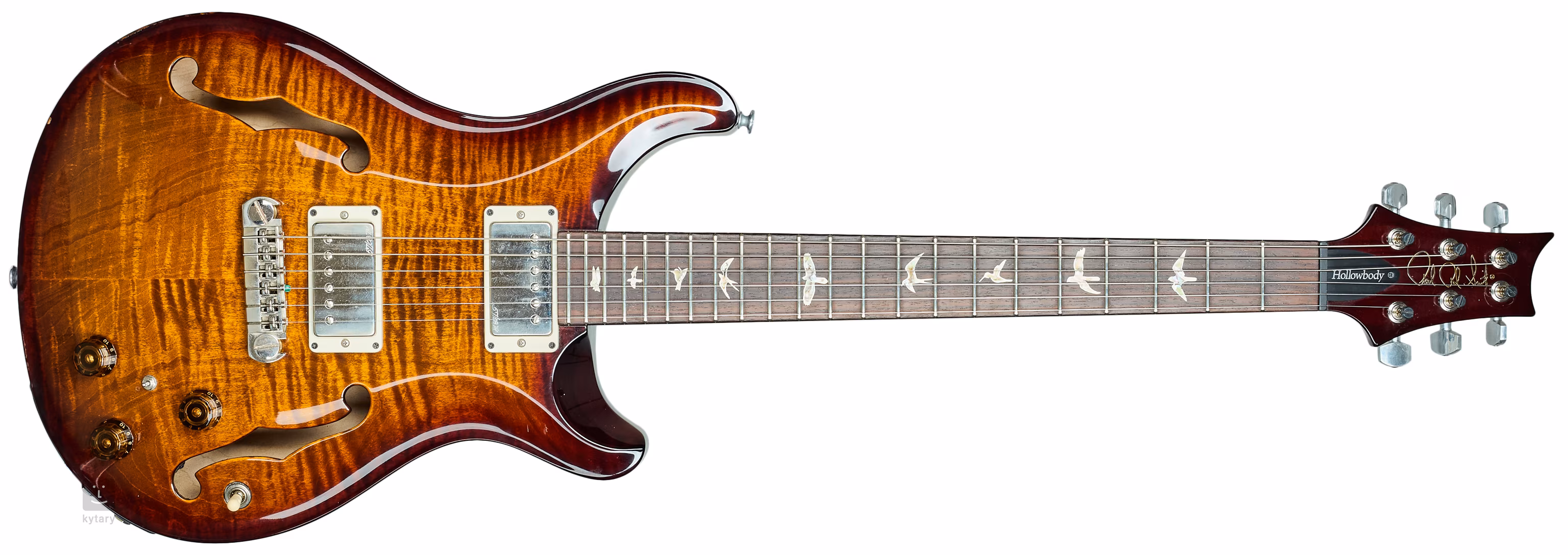 Model Hollowbody 2. generácie s javorovou prednou a zadnou stranou, povrchová úprava Gold Burst dáva vyniknúť kresbe dreva.